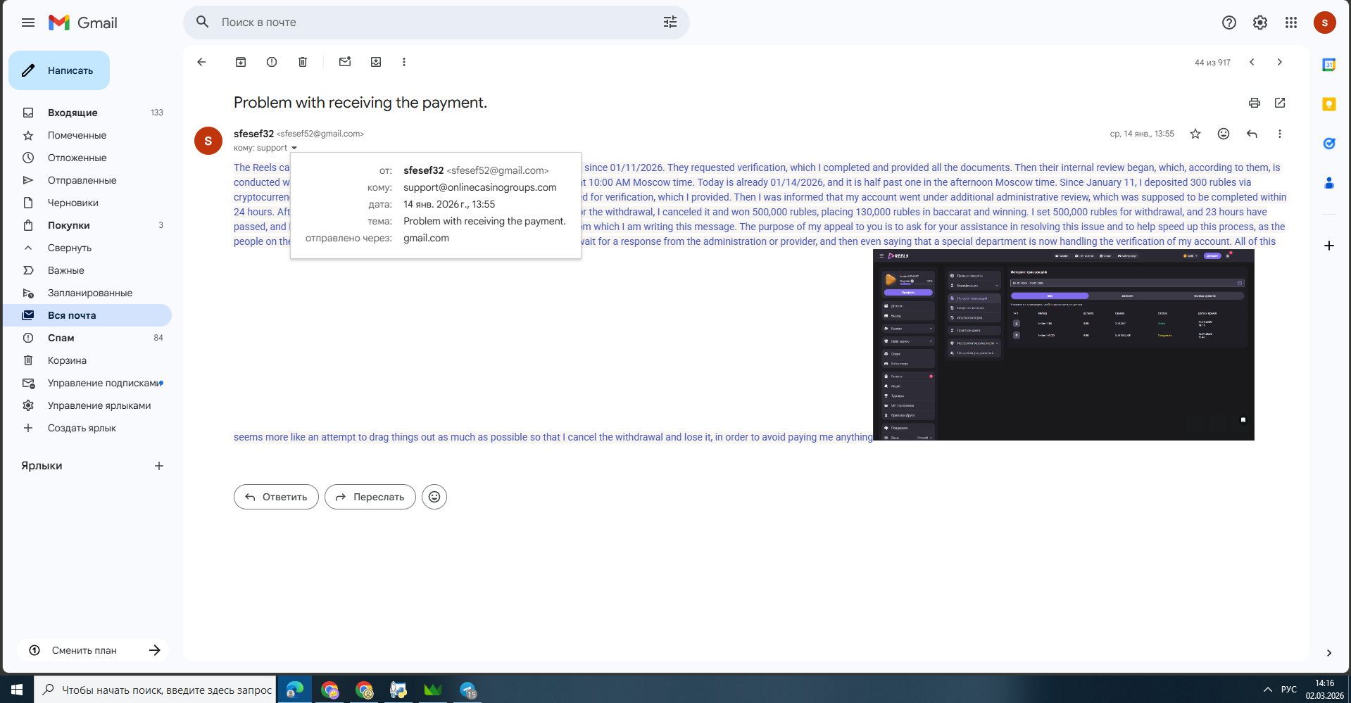 Прэтэнзія Саша Маврин да Reels Casino ад 19.01.2026