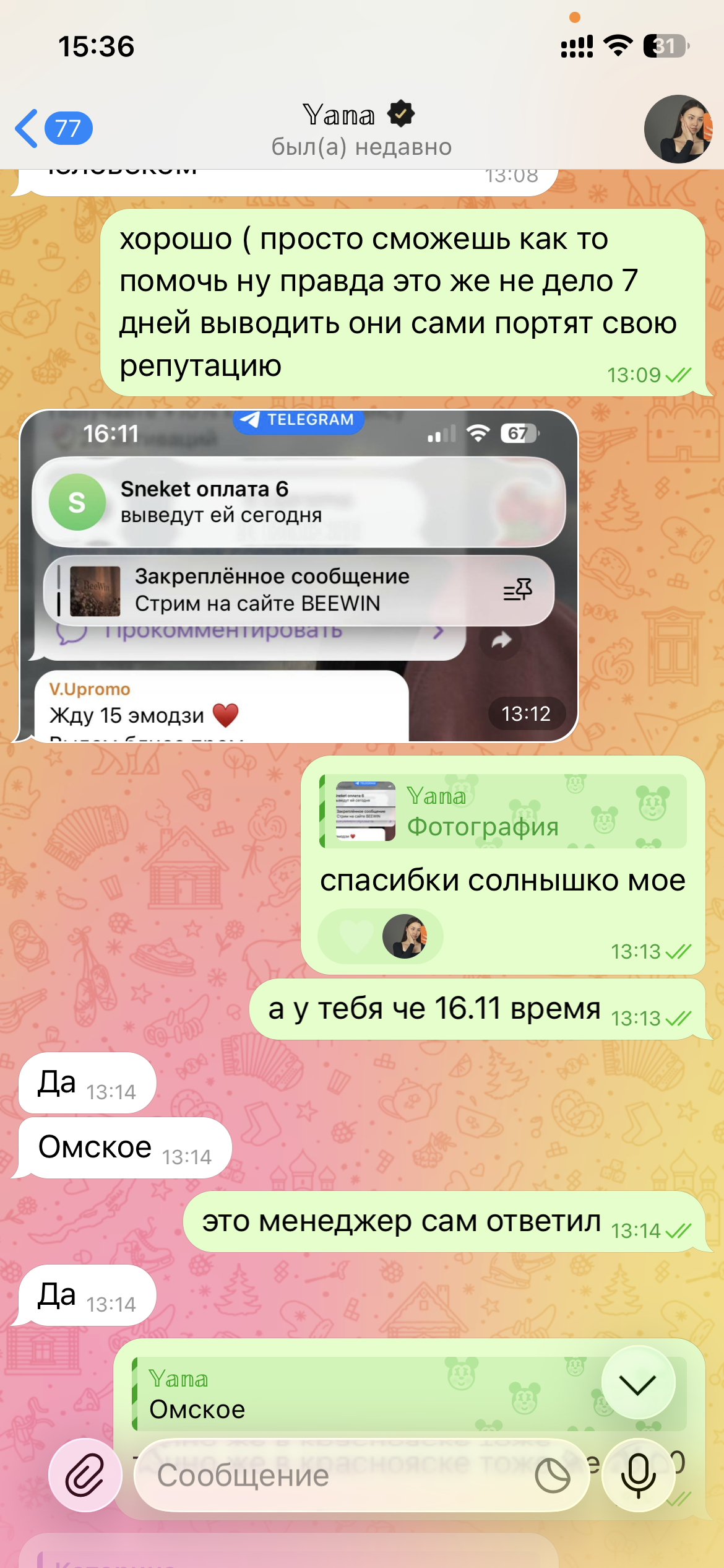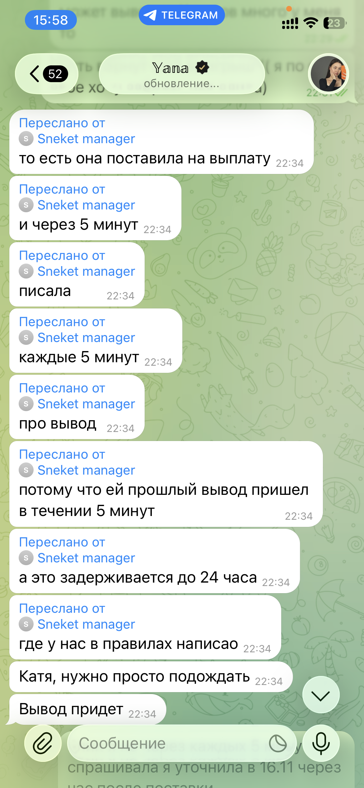 @sneketcasino не трэба ігнараваць усе доказы, скінула, што я не распаўсюджвала ілжывую інфармацыю. У вас цудоўна на сайце напісана, ёсць пункт, што вывад на кашалькі да 1 гадзіны, вось я і запытала. А тое, што з бонуса выводзяць праз 7 дзён, я даведалася толькі на наступны дзень, што і даказвае, што я не ведала пра гэта, таму і пачаўся з вамі спрэчка. Прошу разблакіраваць акк і даць доступ да майго выйгрышу, ён выйграны за атрыманы гэты бонус, выдаўся ў выглядзе кампенсацыі.
