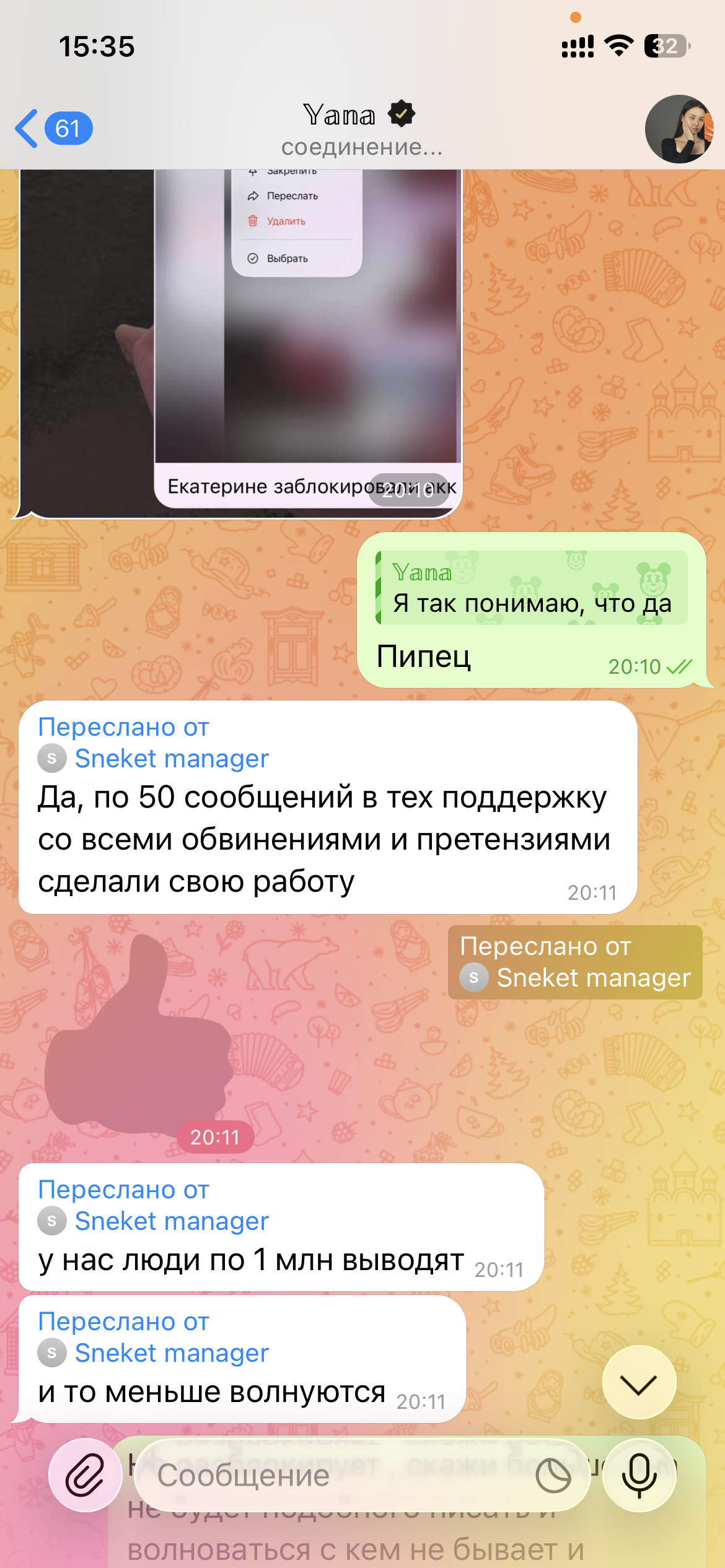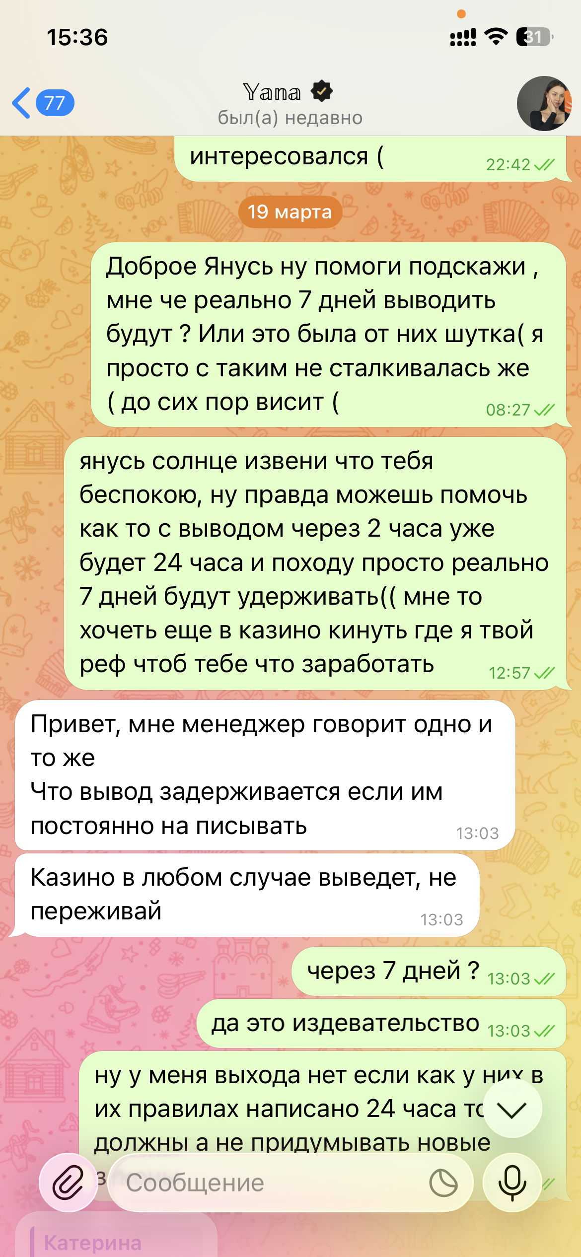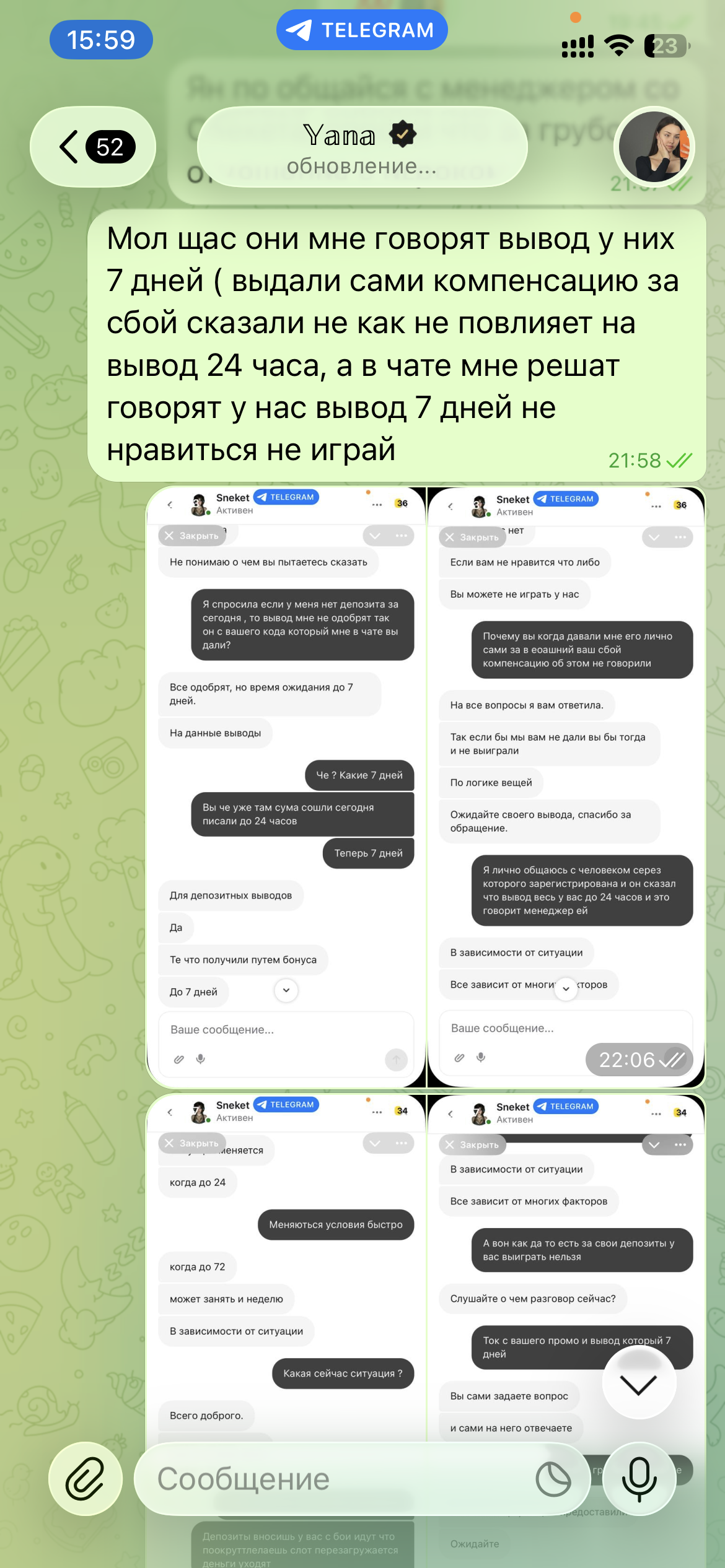 @sneketcasino і вы самі падумайце, калі б чалавек ведаў загадзя, што бонус вашай кампенсацыі будзе выводзіцца 7 дзён, хто б яго ўзяў. Аб гэтым у падтрымцы адразу не сказалі, а калі я выйграла, паставіла на вывад, спытала ў падтрымцы, ці ўсё ў парадку з маім вывадам, на што мне адказалі: чакайце, хутка паступіць. Праз гадзіну я толькі спытала ў менеджара ў Telegram, ці ўсё добра з вывадам, ён мне адказаў, што вывад у нас ад 5 да 24 гадзін. Я спытала, а чаму ў вас на сайце інфармацыя да гадзіны на кашалькі, ён мне адказаў, што не той быццам пункт, чакайце. Тое ж не сказаў мне, што вывад ад 5 да 24 гадзін. Так, не спрачаюся, я перажывала за вывад, пыталася як да, што. Вечарам таго ж дня я пісала ў падтрымку, спытала пра вывад, сказалі, усё ў парадку, чакайце, хутка прыйдзе. Раніцай 19 сакавіка ўбачыла, што вывад так і не прыйшоў, я напісала ў падтрымку, спытаць, на што мне ваша падтрымка і адказала, што маўляў выбачайце, выйгрыш ваш з бонуса, вывад 7 дзён. Я пачала абурацца, чаму адразу не сказалі, мяне ігнаравалі. Напісала свайму рэфу, праз каго зарэгістраваная, скрыншоты ўсе ёсць, даведаццца пра вывад, скрын так сама вышэй ёсць, дзе менеджар адказвае, што выведуць ёй сёння. Увечары, па сканчэнні 26 гадзін, я напісала ў падтрымку, тут яна мне і пачала пісаць: у вас бонусныя вывады 7 дзён. Я па гэтым і пачала пытацца, і ў гэты момант атрымала блакаванне, якое неабгрунтаванае, і скрын ёсць, дзе менеджар рады, што мяне блакуюць, тое што даказвала ў падтрымцы, што мне спачатку нічога не сказалі. Так што давайце вырашым гэта недаразуменне і спакойна дазвольце мне ў вас гуляць, з вывадам майго выйгрышу замарожылі жа, значыць, можна размарозіць. Чакаю вашага шчырага разумення і вяртання мяне ў ваша казіно.