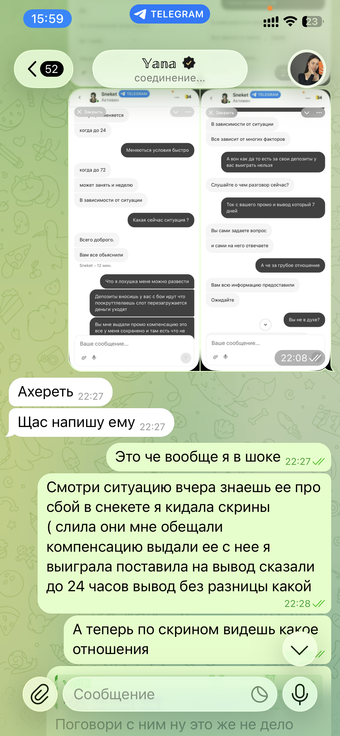 @sneketcasino ёсць нават скрыншот, дзе вы адказваеце майму менеджеру, што выведзеце мне. Гэта было ўчора раніцай, увечары на скрыншотах, якія прыкладзены да скаргі, даказвае, што я спытала, вывядуць ці не. Так прайшло больш за 25 гадзін, на што адразу блакаванне. Атрымліваецца, вы распаўсюджваеце недакладную інфармацыю маему рэфу за мяне, што вывад будзе мне, а па факце — блакаванне. Я не згодная, так я даказала, што нічога не распаўсюджвала хлуслівага, усё па скрыншотах бачна. Прошу вываду майго выйгрышу.