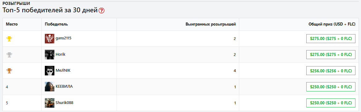- Два прызы разыгрываюцца рандомна ў наступную пятніцу ў 06-00 (UTC).