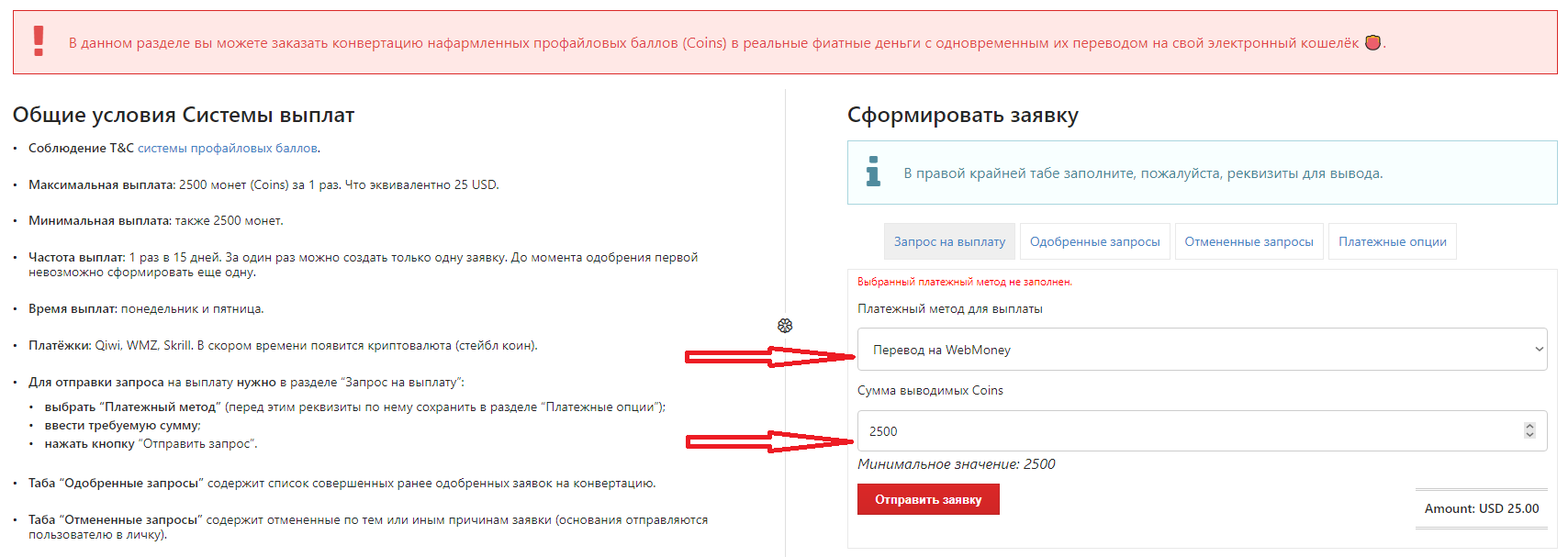 В открывшимся окне выбираем Платежным метод для выплаты и Сумму выводимых Coins.Нажимаем кнопку Отправить заявку и ожидаем средства на выбранный метод.
