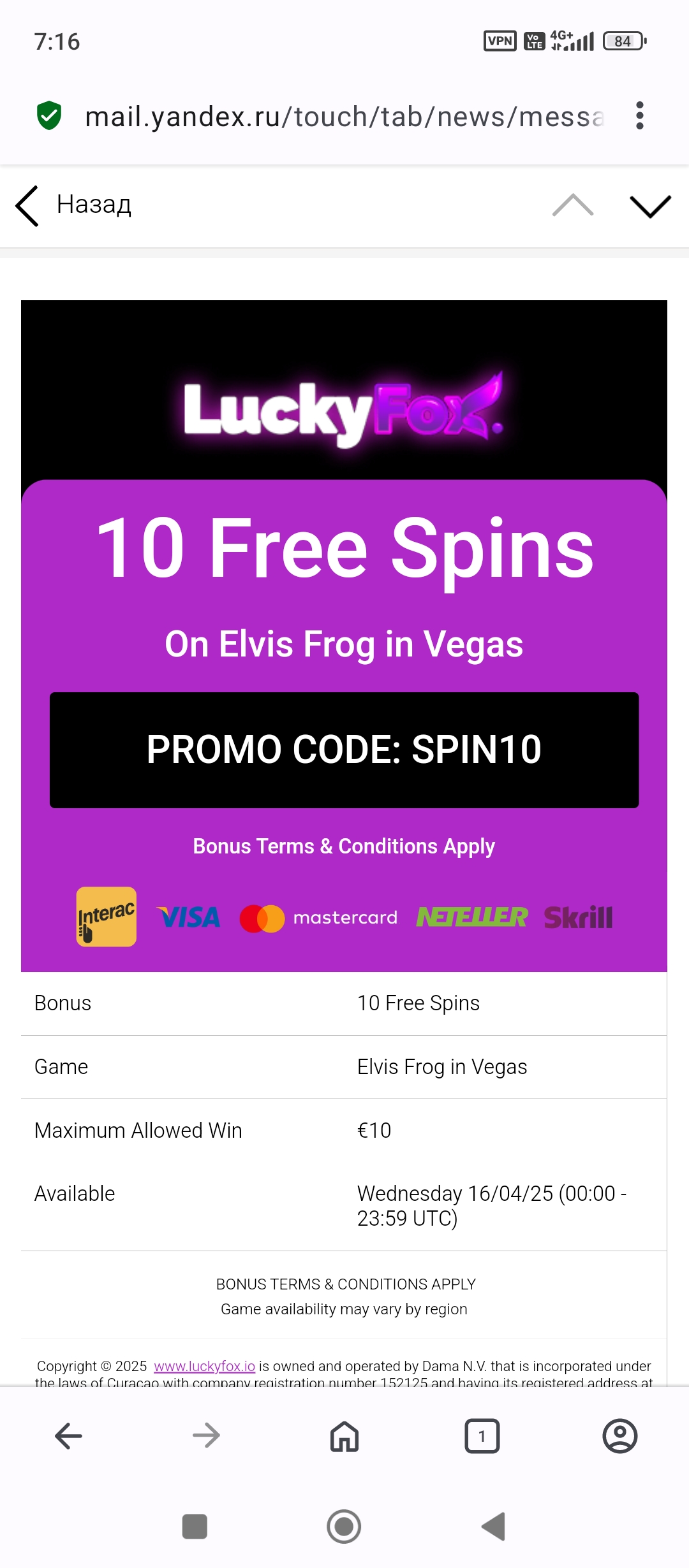 Казино Luckyfox 10 фриспинов по промокоду SPIN10, пришло на почту,максвин 10$![]()