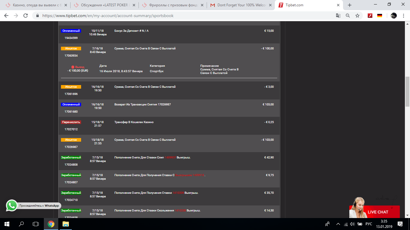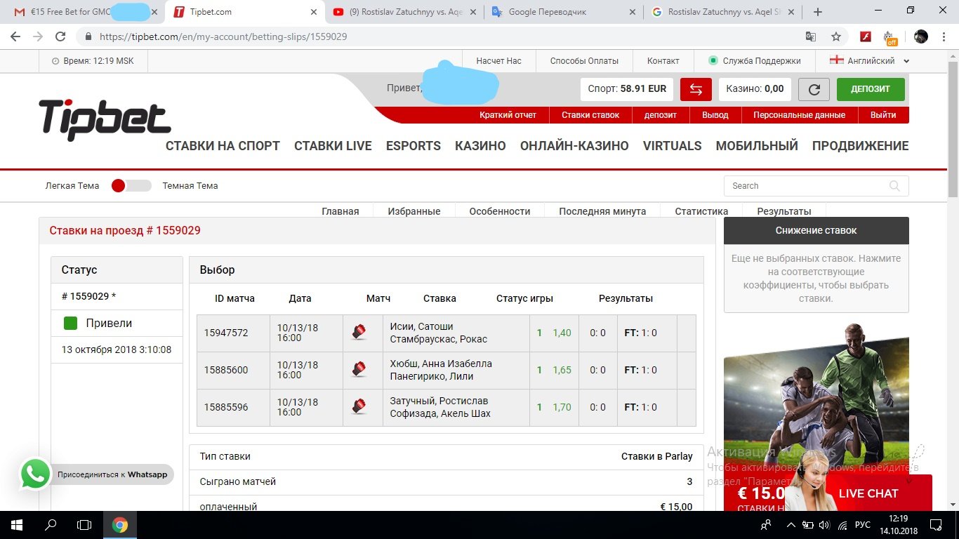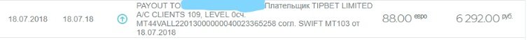в прошлом году в июле отбил бонус в tipbete фриспины вроде были в слоте фрутиспин и вывел максималку возможное 100 евро, при этом не совершая депозита, вывел на банковский счет, (мозг не много поепали с доками) почему-то хз почему пришло всего 88 евро…после этого так же поднял, зашел фрибет они давали 15 евро, ставил на бои экспресс из трех боев, хотел до максималки добить до сотки, но на этот раз не получилось и слил все в казино.