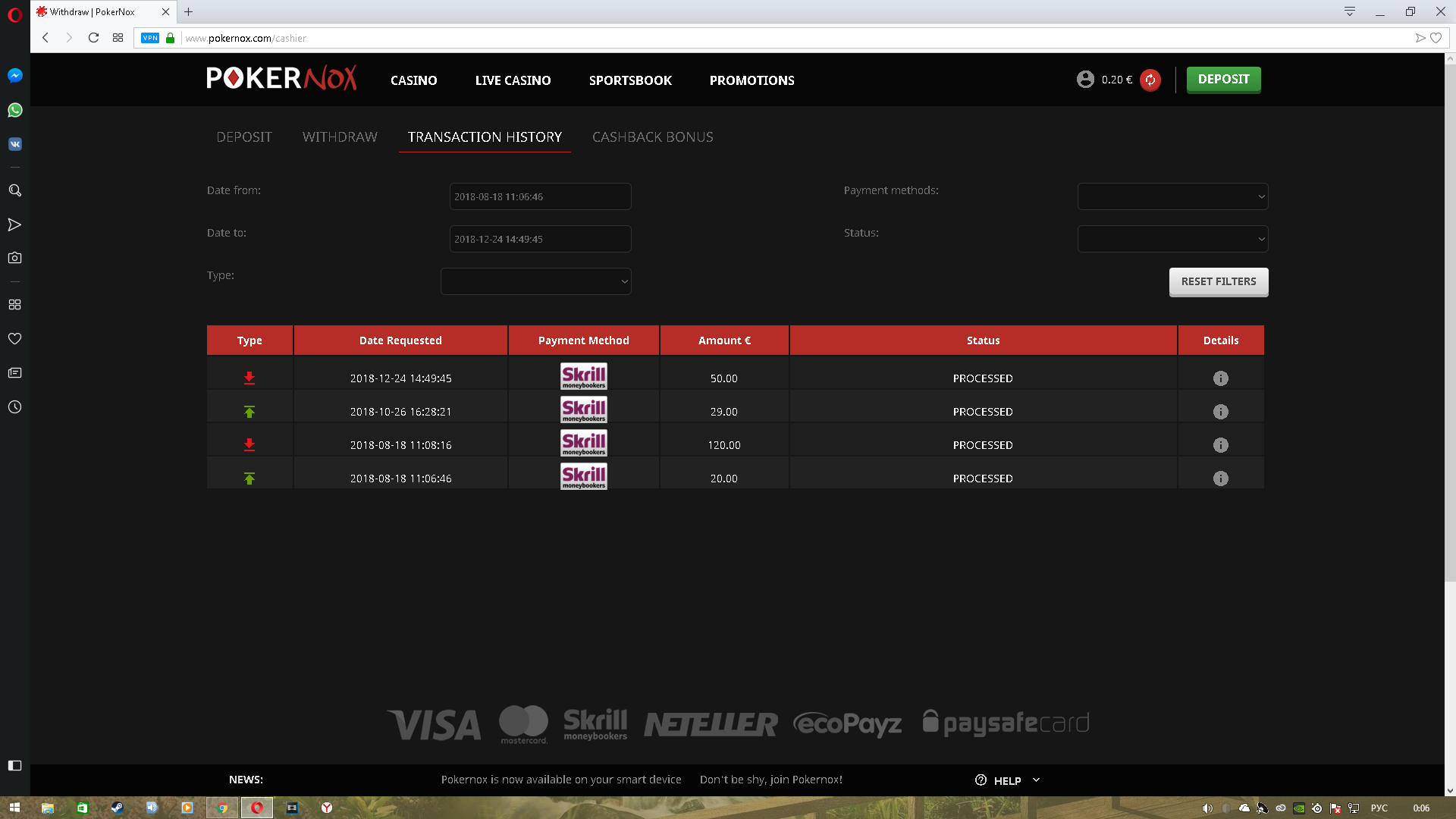 Pokernox вывел с бездепа,на почту пришли 5 спинов в натент,насыпало 28евро,поднял до 68.Тупанул и поставил 50 на вывод,которые успешно вывели,но остатки списали((.Итого 100евро с бонуса за регу и 50 евро за фриспины.