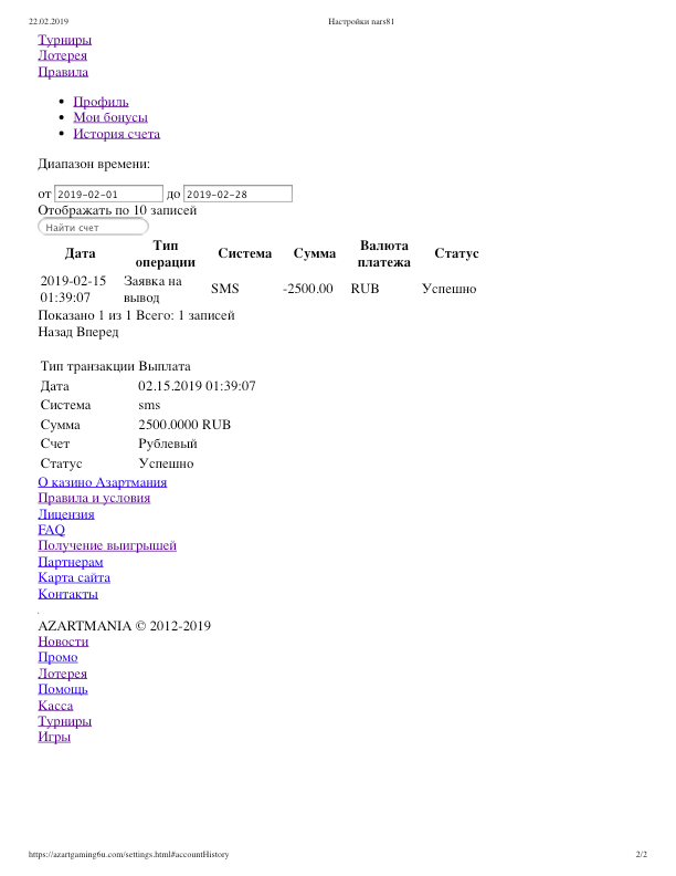 Я недели две назад зашол в азартмания зарегался дали 1000р вегер 50 одбил поставил 2500р на вывод только позвонили спросили я у них регался на сайте я сказал да спросили понравилось ответил норм все втечений 26 часов я посмотрел по историй когда ставил на вывод я выводил на тел смс все пришли честно говоря я самневался даже доки не какие не грузил вобщем порадовали