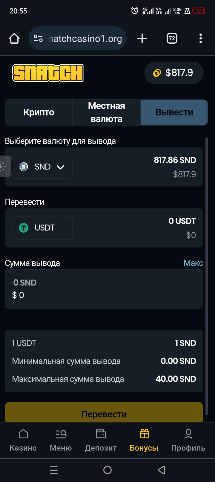 Ох. Отбила я бездеп в снетч в хтом.40 долларов перевела на реальный счет.сколько минимальеый деп модно сделать для вывода? В крипте?
