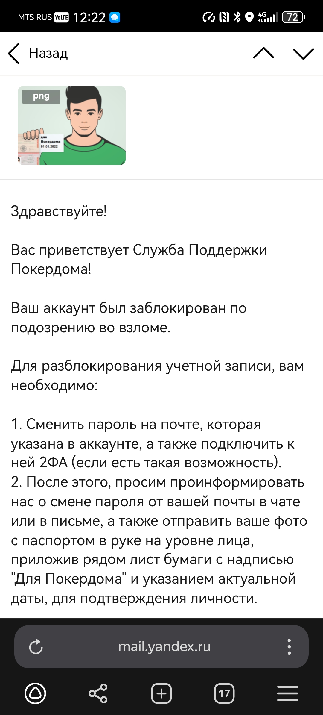 Тоже прислали письмецо, типа кто-то пытался взломать акк и надо сэлфи им с листочком и паспортом, но это п.здёшь сто персент.