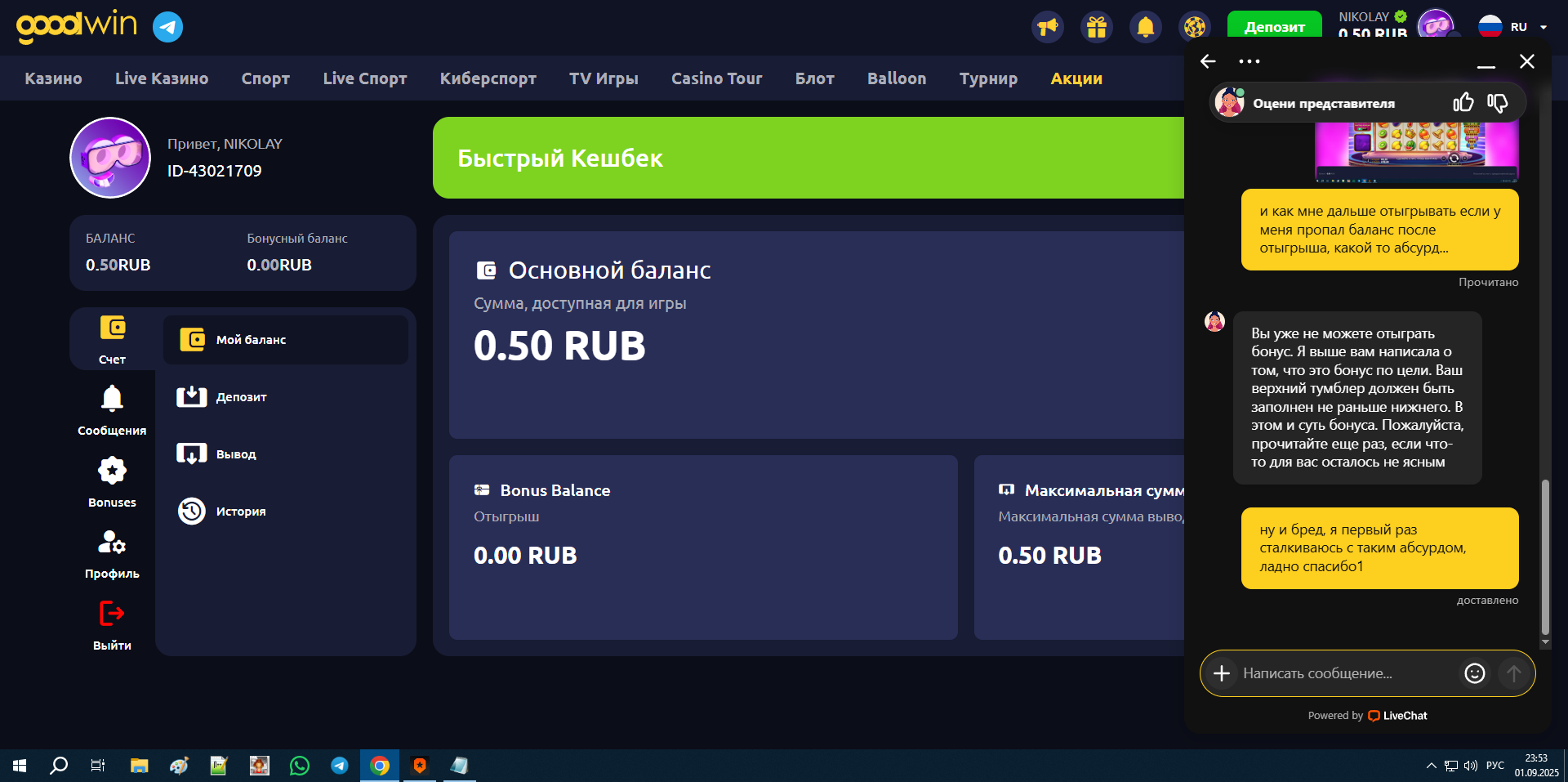 Казино гудвин, это кусок скамной параши, в которую нет смысла крутить даже на фрихи, это на столько омерзительная хуита, что не хочется упоминать, но придется что бы все знали, отыграл эти ссаные 100 фриспин, в одном слоте, по 20р ставка, все как было указанно, сразу после отыгрыша вместо того что бы 500р упали на балик, у меня повился еще один вагер. выше первого отыгранного, в поддержке сказали это – ” бонус «по цели». То есть выигранную за счет фриспинов сумму нужно увеличить в 10 раз на протяжении 10-кратного отыгрыша.