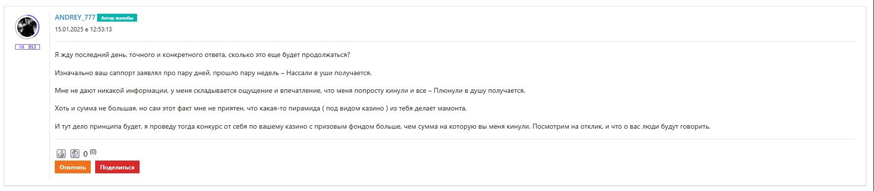 Моя жалоба висит, последняя жалоба на этот проект была от людей пол года назад, про это казино люди давно уже забыли, да и представителя нету на форуме.
