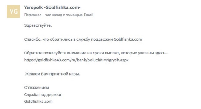 И сегодня мы готовы объявить вам о следующих важных изменениях, которые станут крутым поворотом в развитии Голдфишки. Речь пойдёт о самом важном моменте при выборе казино – депозите и выводе денег. Нам стало очевидно, что указывая максимальные сроки вывода, мы скромничаем и не говорим, что, согласно регламенту, запросы обрабатывается 2 раза в день по будням и раз в день в субботу (в воскресенье запросы не обрабатываются).