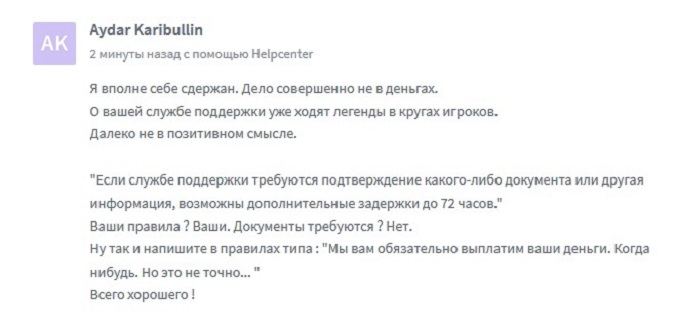 Хз, мне только раз вывели в срок менее 24 часов. Если бы выплату одобряли в течении 5-6 часов, как здесь анонсировано и средства становились бы недоступны к возврату в игру, то буквально вчера вот этого бы не случилось. Не присутствовал бы неприятный осадочек.