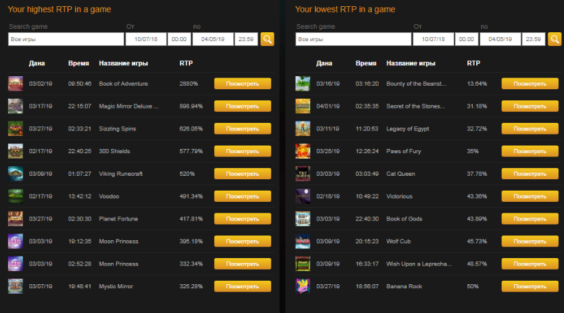 на некоторых сайтах есть спец.вкладка. на Видеослотс есть и она типа для того, чтобы игрок видел где ему везет, а где нет, просто я ее использую наоборот)