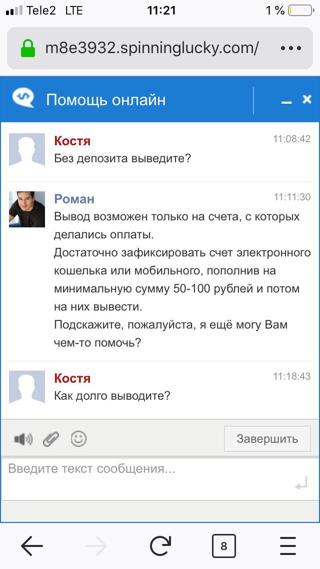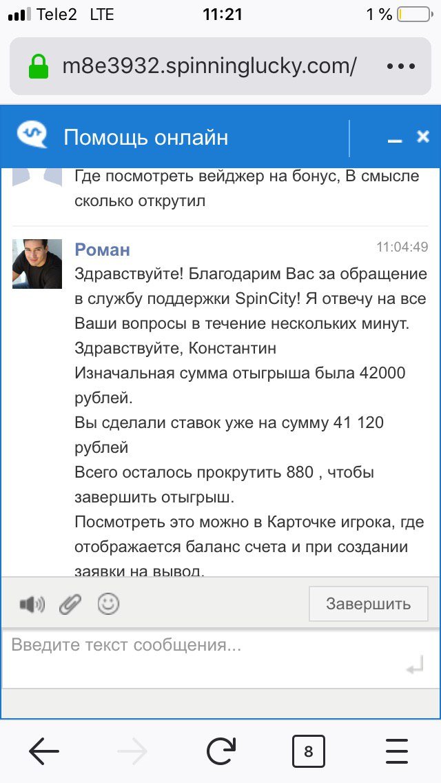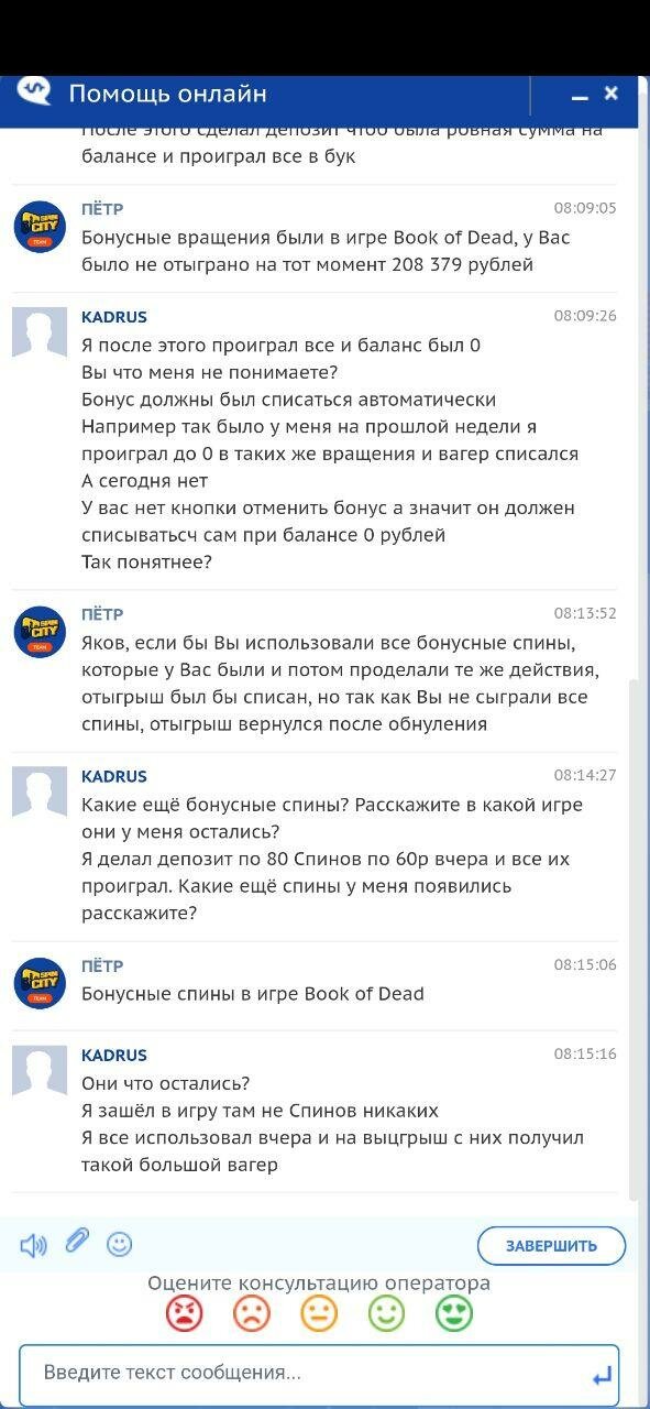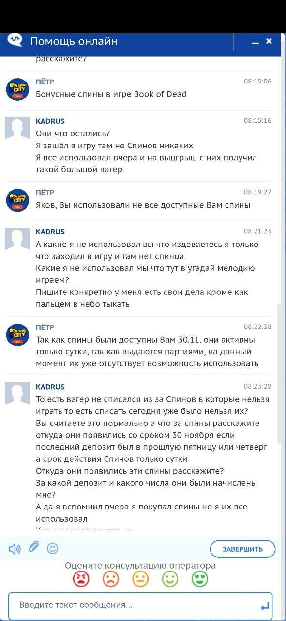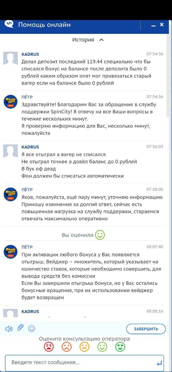 позавчера делаю депозит 1ю5 к под спины в букофдеад проигрываю все смотрю что на балансе 0 делаю скрин и после депозит выигрываю 5к но на вывод поставить не могу откуда не возьмись возобновили вагер. хотя не понятно как это возможно ведь на балансе был уже 0. ладно далее я проигрываю все деньги около6к. делаю опять скрин о том что на балансе 0. пишу в чат с просьбой проверить бонусные спины отложенные и есть ли у меня вагер отвечают что вагера нет вы можете играть я иду играть выигрываю 4к но при создании заявки у меня опять появляется вагер. ну это пздц какой то как это можно объяснить я не знаю. никаких бонусок не откладывал но получилось так что во время отыгрыш в слоте роботы от а квикспина был в основной игре рандом из 2х спинов по 20р и после 1 спина я почему то вышел в другую игру но это же не отложенная бонуска а единичный спин.
