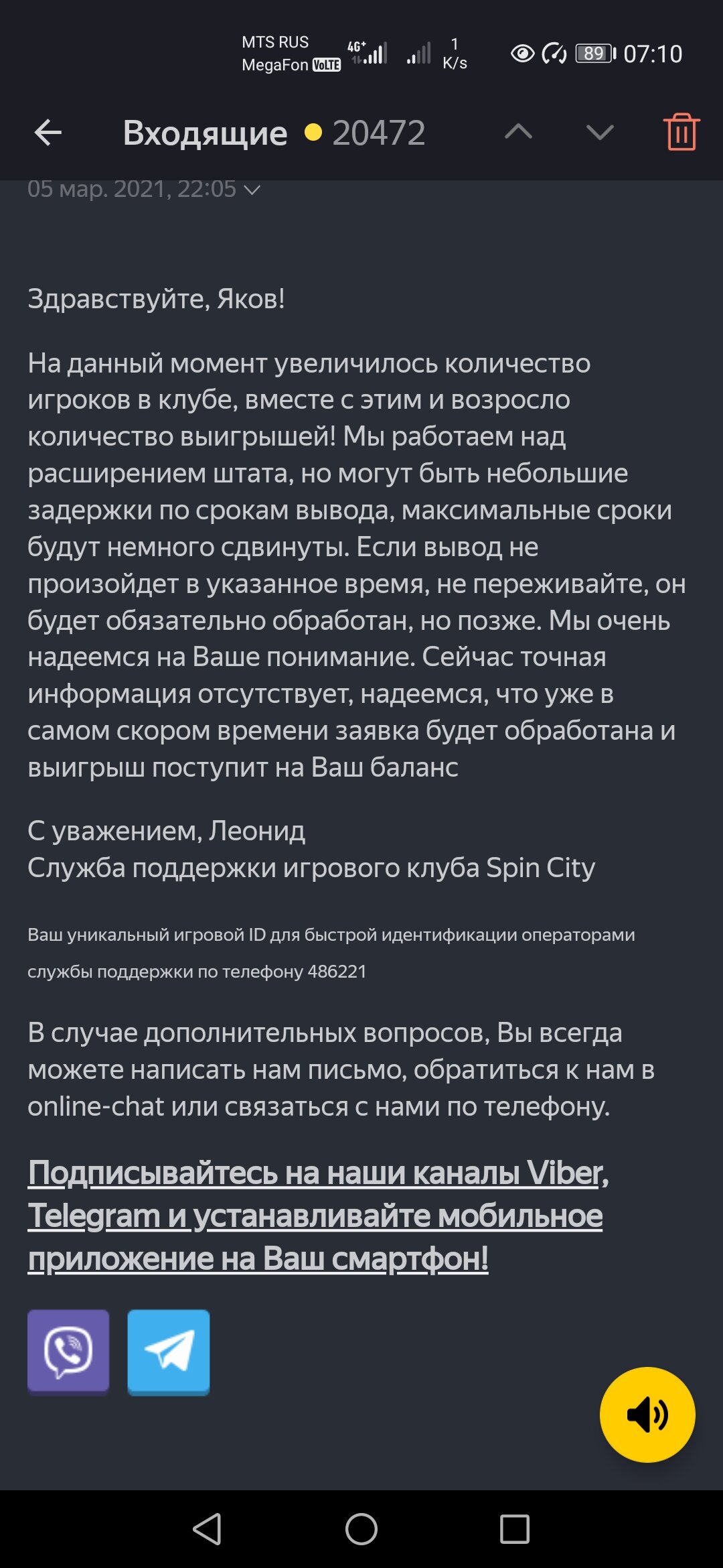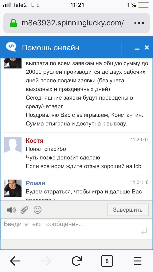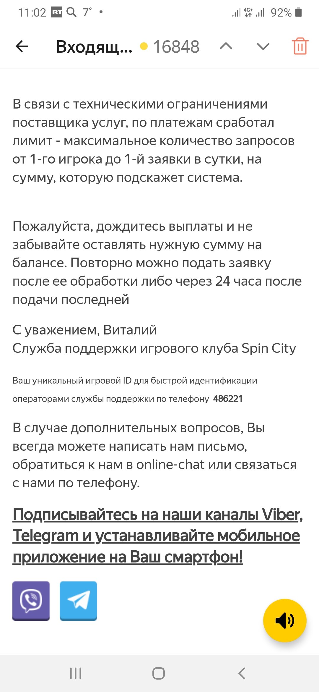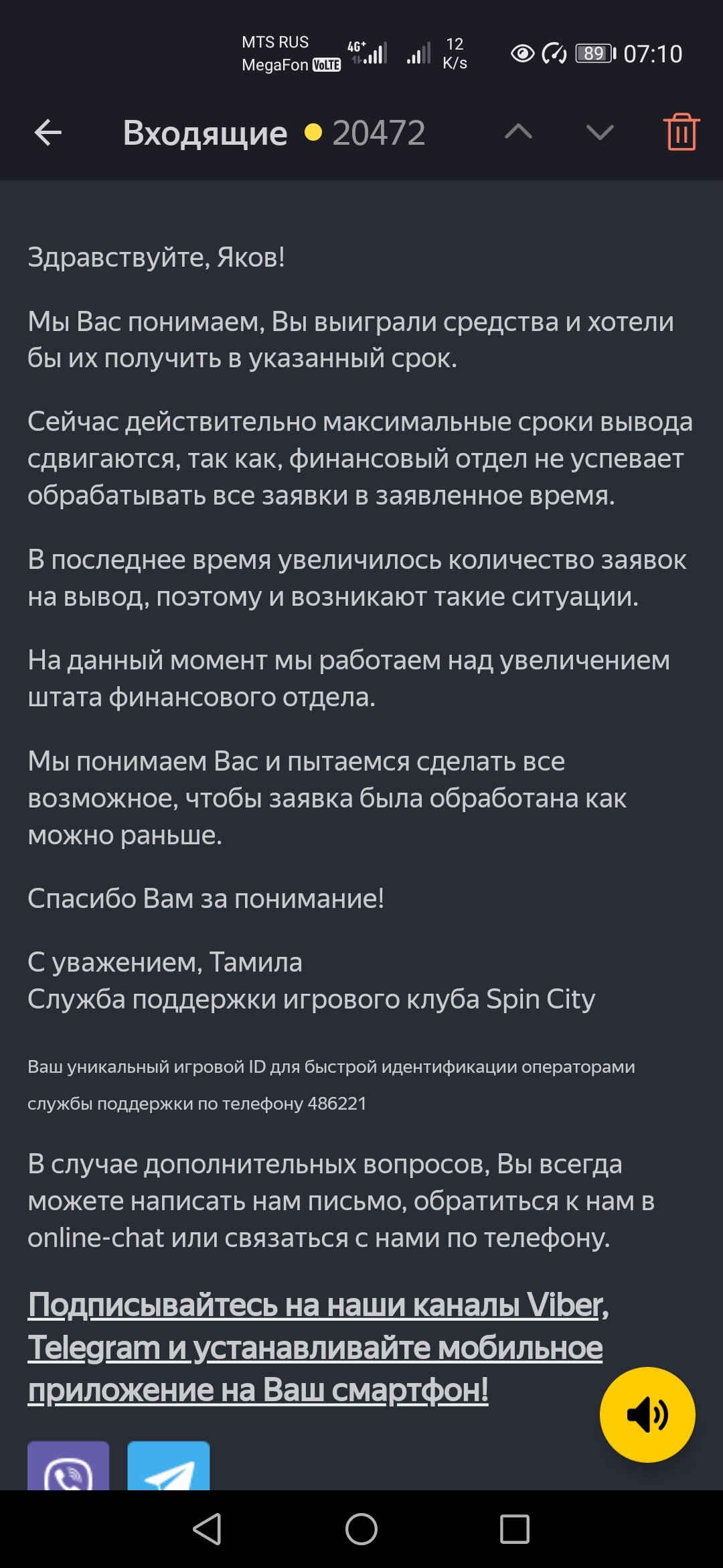 Зачем ты докопался до этого казино не пойму ? Ты хочешь, чтобы они вывели быстро, но как я понял из переписки нет у них регламента, значит войди в их положения и жди очереди. Не заёпивай их, а то могут пустить по бороде. Короче переписка у тебя есть, где просят подождать и надеются на твоё понимания. Не спеши, если ты игрок и всё будет зашибись. Я так и делаю, выбираю казино и хожу по слотам и если вижу нет пейаута нигде то выхожу из казино и потом постоянно проверяю. Терпения друг мой и как говориться будешь в выигрыше, спешка в игре не нужна, тихо едешь дальше будешь. Терпения и удачи.