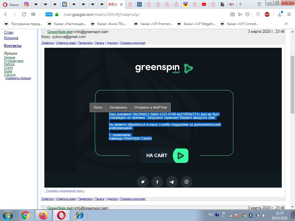 Вчера как умная Маша я получил бездепозитный бонус 10$ в казино Greenspin.bet…После 4 часов спинингования бунус был отбит, после этого я делаю депозит с Киви 5$ и ставлю на вывод 95$ (так как максимальная выплата с этого бездепозитного бонуса 100$).