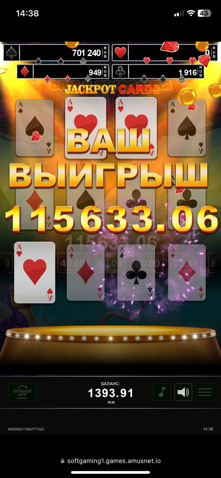 @viktoriya888999 я выигрывал два таких джекпота, причем играл со ставкой до 40р. Но суммы там на балансе были гораздо меньше.