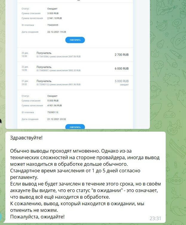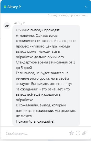 Как только будет информация – мы сразу дадим обратную связь! Снова задаю вопрос как мне вывести средства, получаю ответ – Попробуйте повторить попытку вывода средств на другую банковскую карту или другим методом. Ставлю вывод на другую карту и что… ничего …cyka снова тишина и ожидайте выплату от 1-го до 5 дней 😁 это полный пздц…