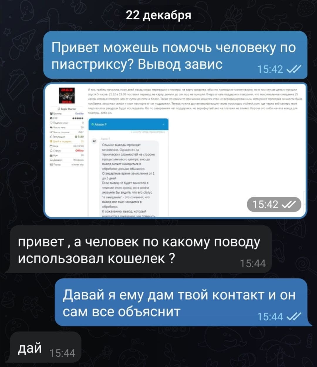 в общем я тебе скинул в лс его тг, хочешь пробуй решай. бегать туда сюда и работать передатчиком я не буду