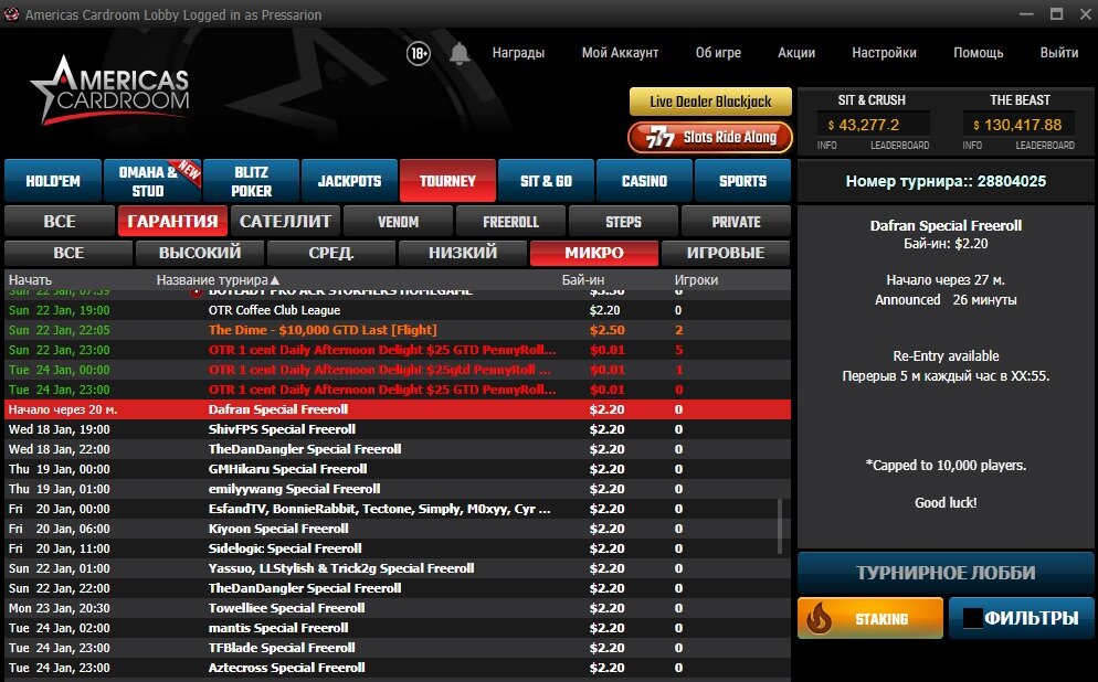 Покерные фрироллы проходят вплоть до 11 февраля. Смотрите во вкладке гарантия – микро. Там стоимость 2.2 баксов, но первый вход бесплатный. По паролю! Пароли на твич каналах, просто в поиске вбивайте стримера, его название написано в названии фриролла, там в принципе есть ссылка на канал. 5000 и 10000 долларов гарантия + 1000 долларов за выбивание стримера.