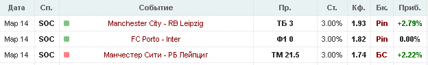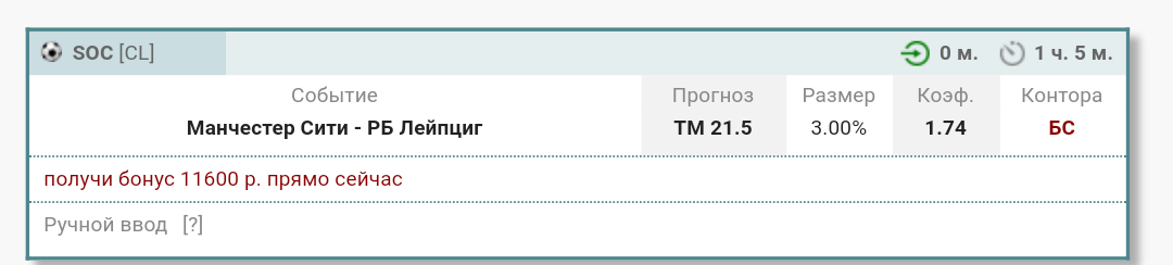 Если в игре МС – РБ Лейпциг не будет игры на контору, то верх тотал должен пробиваться на изи. Я выбрал самый безопасный вариант, та как по форе в пользу сити может быть неоднозначно, натпобеду очень малый кэф. В ЛЧ Сити не стабилен в обороне, так, как в АПЛ. А Лейпциг не стабилен с ТОП опонентами + в Сити скамейка более надежна на достежение результата. Кто хочет, может взять гол Мареза или Голанда.