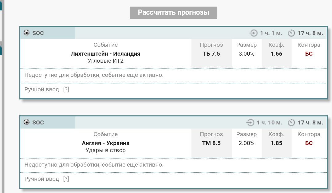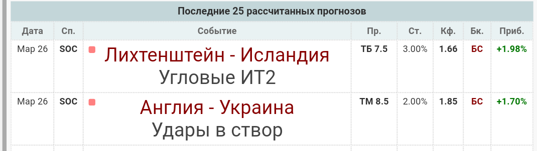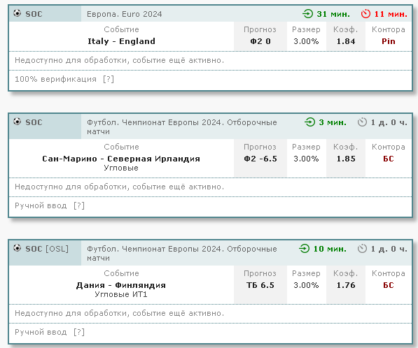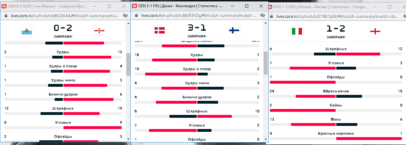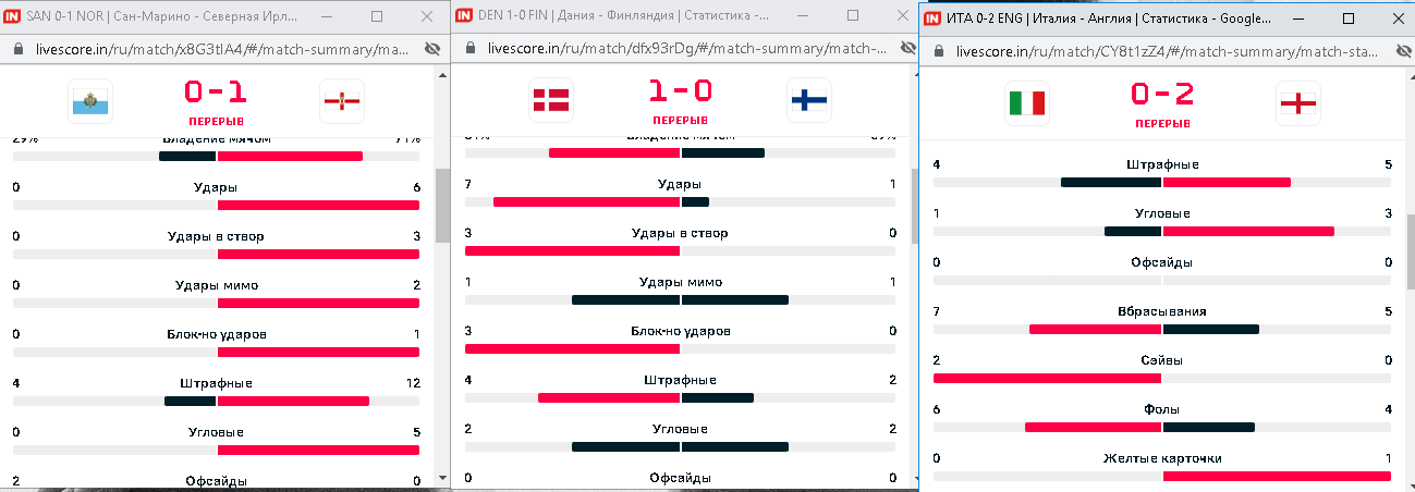 Ну что, пока 3 из 4 после первого тайма событий заходит на легке и на ура. Англия уничтожает итальянцев, по фолам все четко, Итальянцы будут торопиться, много ошибаться и как в следствие продолжат фолить. Северная Ирландия штучки 3-4 угловых еще я думаю подаст во втором тайме как минимум, Сан-Марино еще подсядит немного в плане физики. Если чудом каким-то Дания 5 угловых сделает во втором тайме, будет кайф вообще, но что-то сонмеваюсь уже, посмотрим
