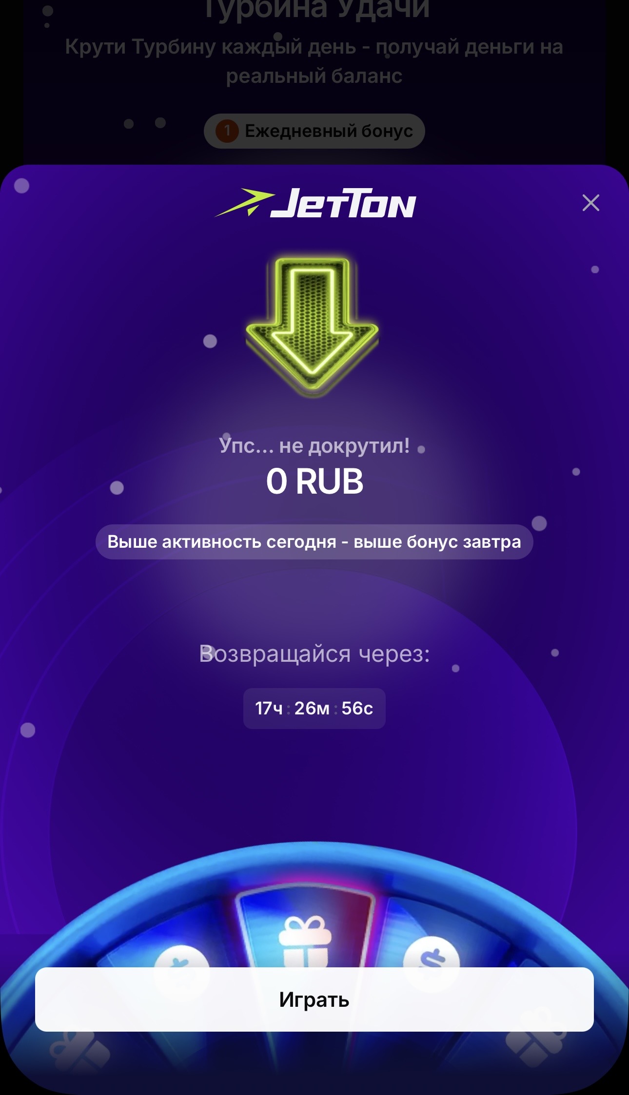 @lylia значыць не зусім залежыць ад прайгрышу … хутчэй за ўсё залежыць ад абароту ў слотах, і вельмі малы %…