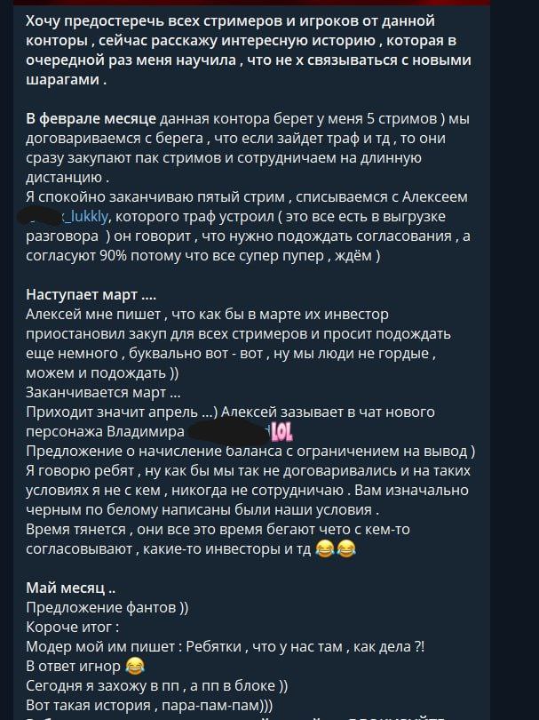 Здравствуйте. Я представляю интересы стримера Неженка Пироженка и хотел бы прокомментировать ситуацию, связанную с сотрудничеством с проектом LUKKLY.