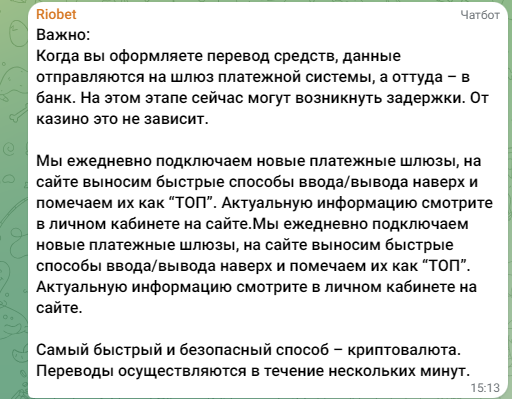 Ну а с картами понятно, туда вообще лучше не лезть, но риобет и на другие платежки не может вывести.