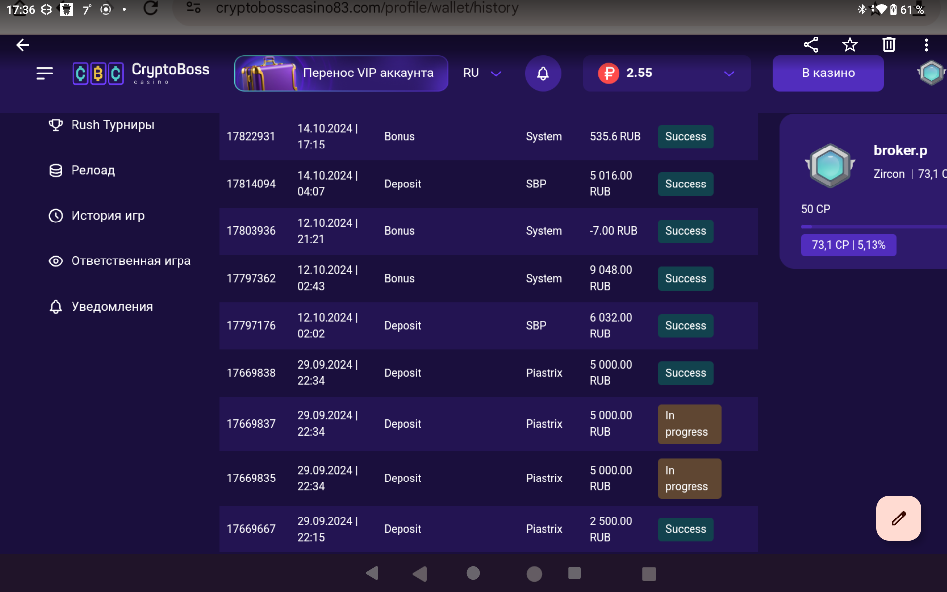 К слову,решил посмотреть на лояльность Криптобосса и в чате спросил положены ли какие начисления,фриспины и прочее мне,как игроку данного проекта,тем более я слил больше 100.000 за несколько дней у них ранее и уже более не в плюсе а в минусе у них!Ответ поразил.Ничего не положено!!!Странно,депозиты вношу от пяти тысяч,а так сразу 10.000 или 20.000 за раз, игра, по предмаксимальным и максимальным ставкам,не маленьким скажем так в лайв рулетки ,к слову,я у них примерно несколько раз на баланс набивал до 50.000 с 10.000 депа так через какое то время система сливала мгновенно,думаю они отслеживают системно и по достижении какого то лимита программа переключает ак игрока на слив. Ноль в рулетки без единной оплаты в принципе!Один раз с 80.000 ни одной оплаты в рулетку не получил!!!В ноль все до упора🤷💩🤔Так вот,спросил за какие начисления и был послан тактично куда подальше,к дядюшке фую….ну да ладно,понимаем,им сейчас тяжело ,всем тяжело.Как оказалось,квот такие вот они по лояльности к нам,к игрокам!