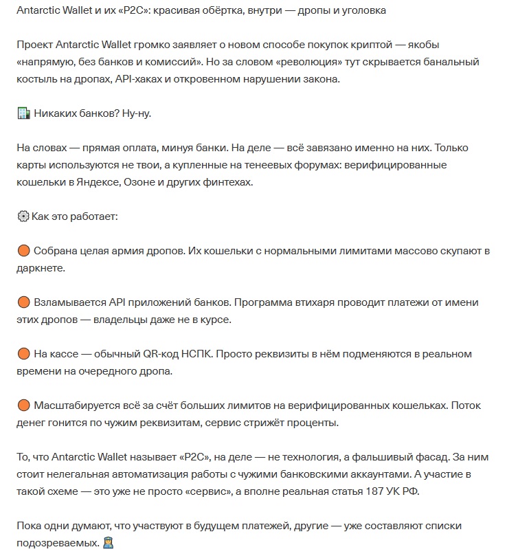 На Antarctic Wallet для пакупкі і продажу крипты трэба выкарыстоўваць карты і рахункі на сваё імя, інакш транзакцыі, хутчэй за ўсё, не пройдуць, і вывад грошай на чужую карту будзе немагчымы. Выкарыстанне карт жонкі або знаёмага рызыкоўнае і, як правіла, забаронена, таму бяспечна працаваць толькі са сваімі рэквізітамі.