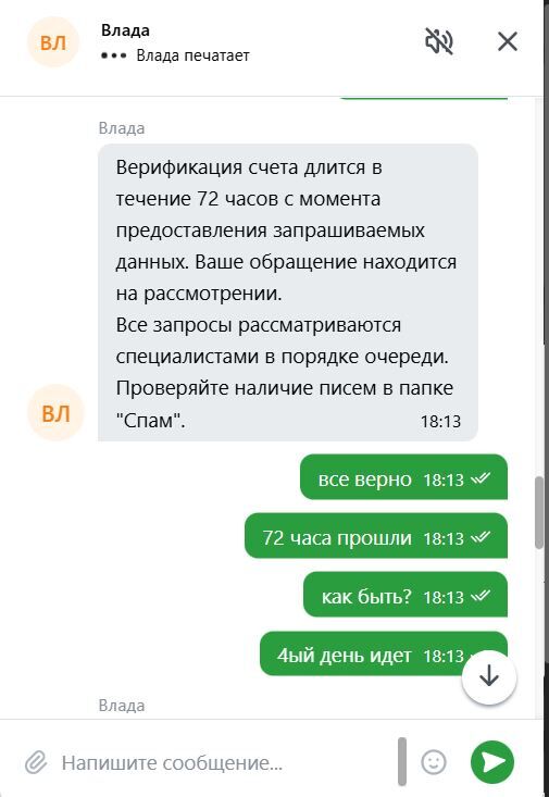 Идет 6 или 7ой день верификации и игнора,ответы в чате онлайн консультанта поражают.