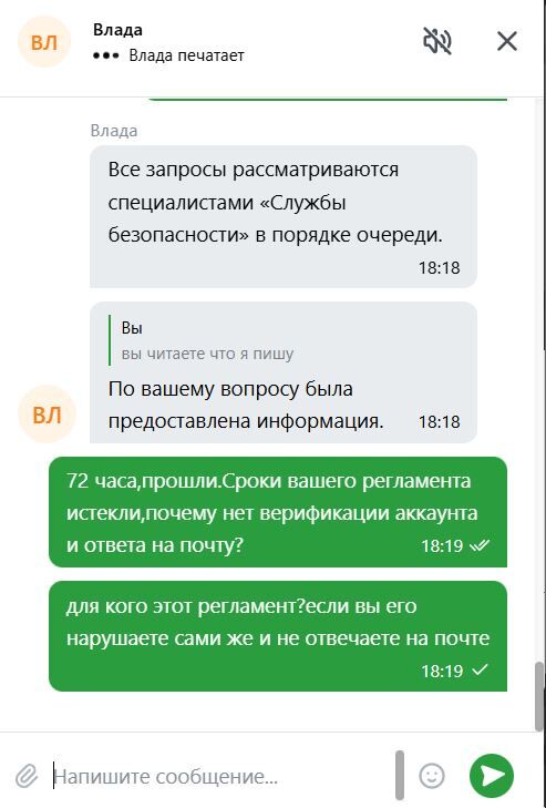 (3 скрин) запрос 19 стр паспорт и игнор уже на более 4 часов и служба безопасности ушла в игнор.