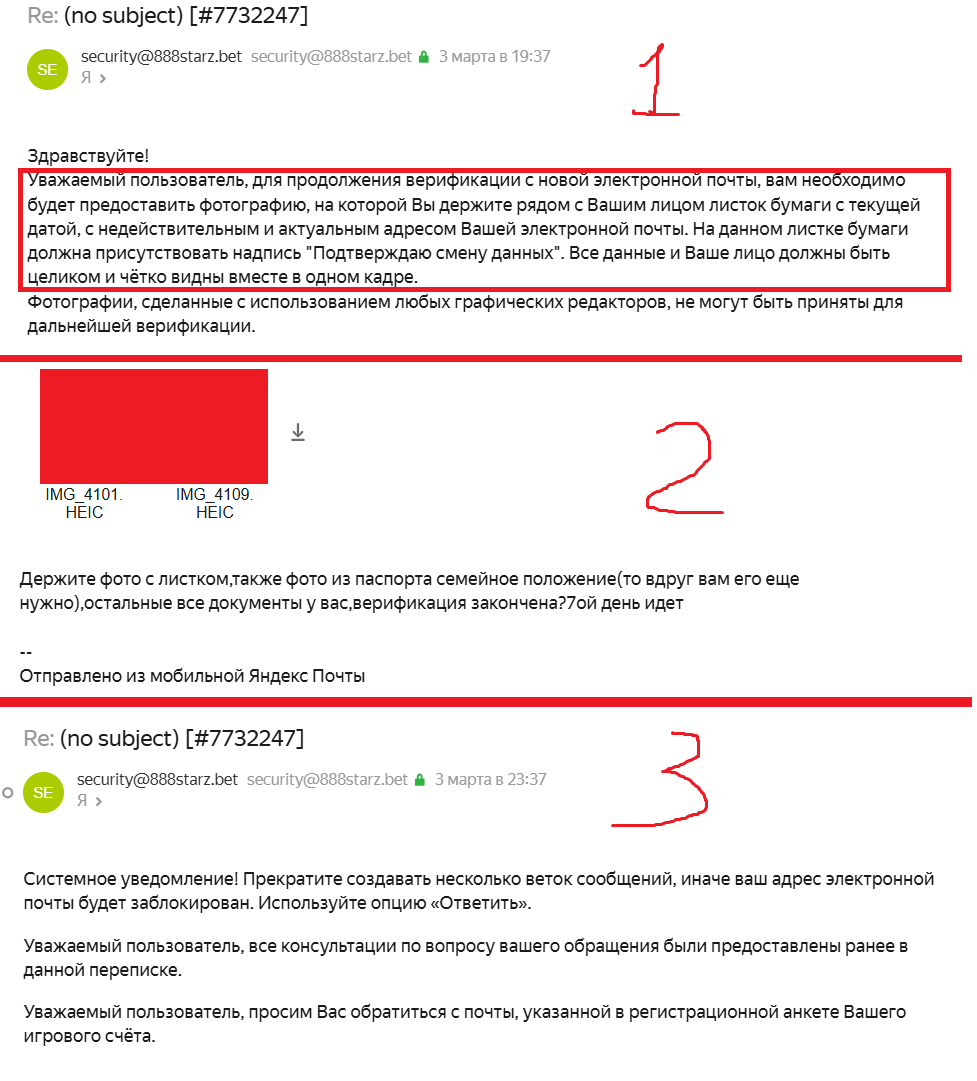 Весь диалог сделал в одном фото (1 – инструкция по смене почты от сб.,2 – отправка запрошенного фото,3 – их ответ и решение.)