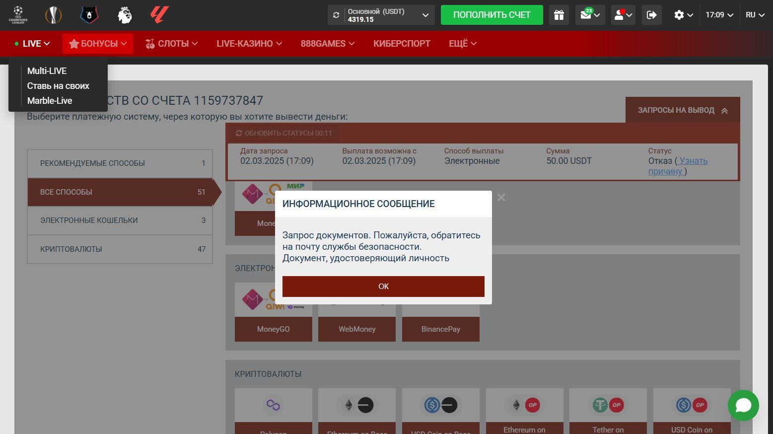 Информации мало, во что играли то слоты, лайв, бк?