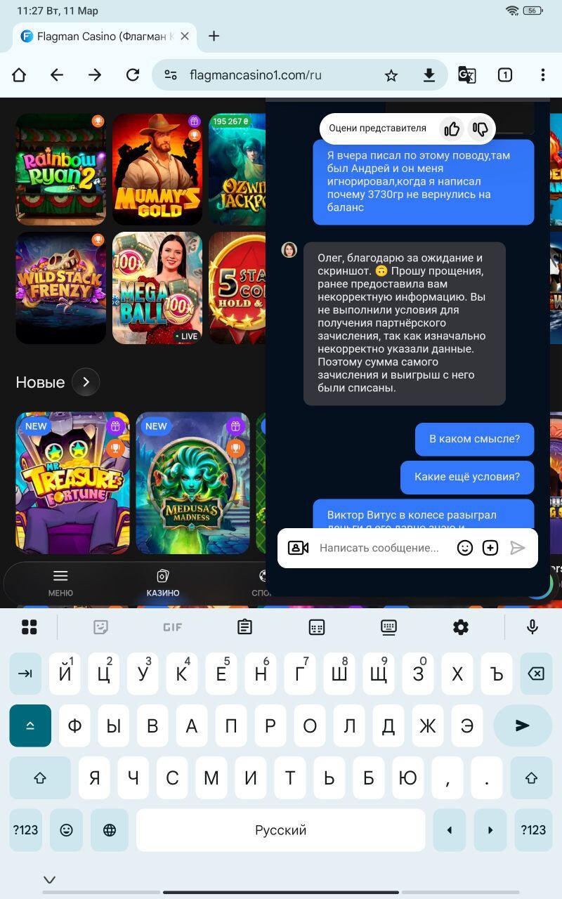 Написали для вывода средств нужно сделать депозит, сделал депозит, открутил его х3, и баланс исчез, написал в поддержку оператор Андрей ответил, задал ему вопрос, куда мои средства с баланса делись? он морозился минут 40 и закрыл диалог, на следующий день написал в поддержку ответила Марина(вроде) ответ был такой: мы списали ваши выигранные бонусные средства из-за того, что вы якобы не выполнили условия и указали в данных имя с ошибкой! Я не много в шоке был от такого поворота, задав ей вопрос, я же выиграл у стримера эти деньги, то есть это он мне дал их в руки, как вы можете у меня их отобрать, даже если я сделал ошибку в имени, возможно имя ввёл с цифрами случайно, но это не меняет суть, то есть ты выигрываешь радуешься и ещё выигрываешь после в аппараты и у тебя просто берут и забирают(воруют) эти деньги и ссылаются на какие-то правила непонятные, я верифицировал аккаунт сразу всё хорошо, но деньги украли, прошу, что бы со мною связались руководители или представители этого казино более адекватные, и обьяснили как так получается, что человек выигрывает деньги и из-за условной ошибки в имени(когда аккаунт ещё не верифицирован) аннулируют выигранные деньги, всем будет очень интересно почитать ответ этих деятелей, которые придумывают такие якобы правила, по каким возможно, когда игрок выиграет большую сумму денег они скажут что у него не верно был указан скриншот какой-то и аннулируют выигрыш в 1 миллион к примеру. Прошу вернуть мне мой выигрыш, данные правила этого казино не соответствуют никаким стандартам и являются неприемлемыми!
