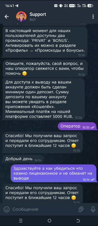 Скам, во-первых у данного казино нет мини аппки в телеграм, во-вторых дизайн отличается(иконки баланса, рассположение элементов на странице), в третьих в системе нет таких промокодов, ниже скрин скину