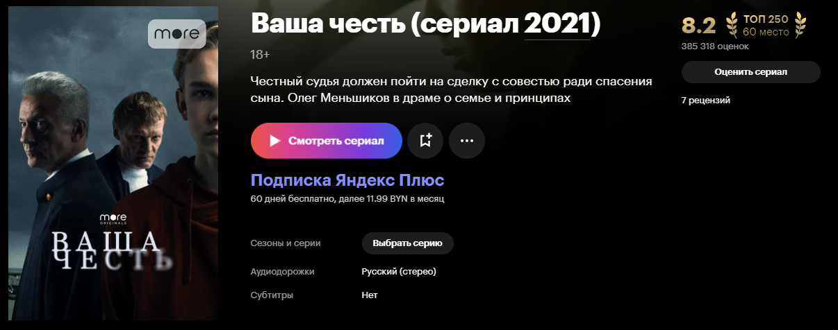 Также у многих кино-блохеров видел в прошлом году в топах сериал “Ваша честь“. Ну думаю, не могут же они врать). Остановился смотреть эту богодельню на четвёртой серии. Ну уже просто перемутили в полном смысле этого слова. Даже братья Гримм в своих сказках такого не сочиняли, просто дичайший абсурд. Есть моменты, где просто от этого абсурда становилось ну дико смешно.