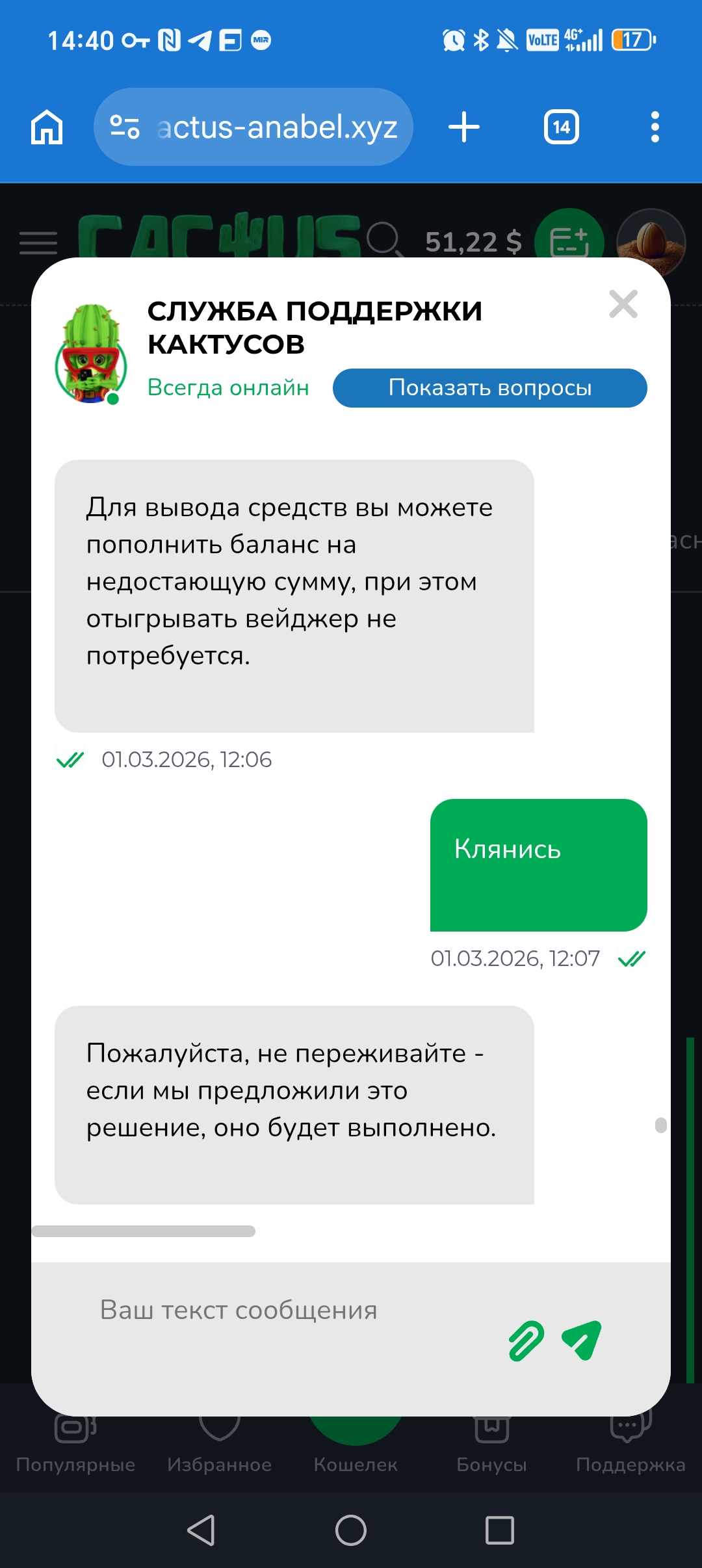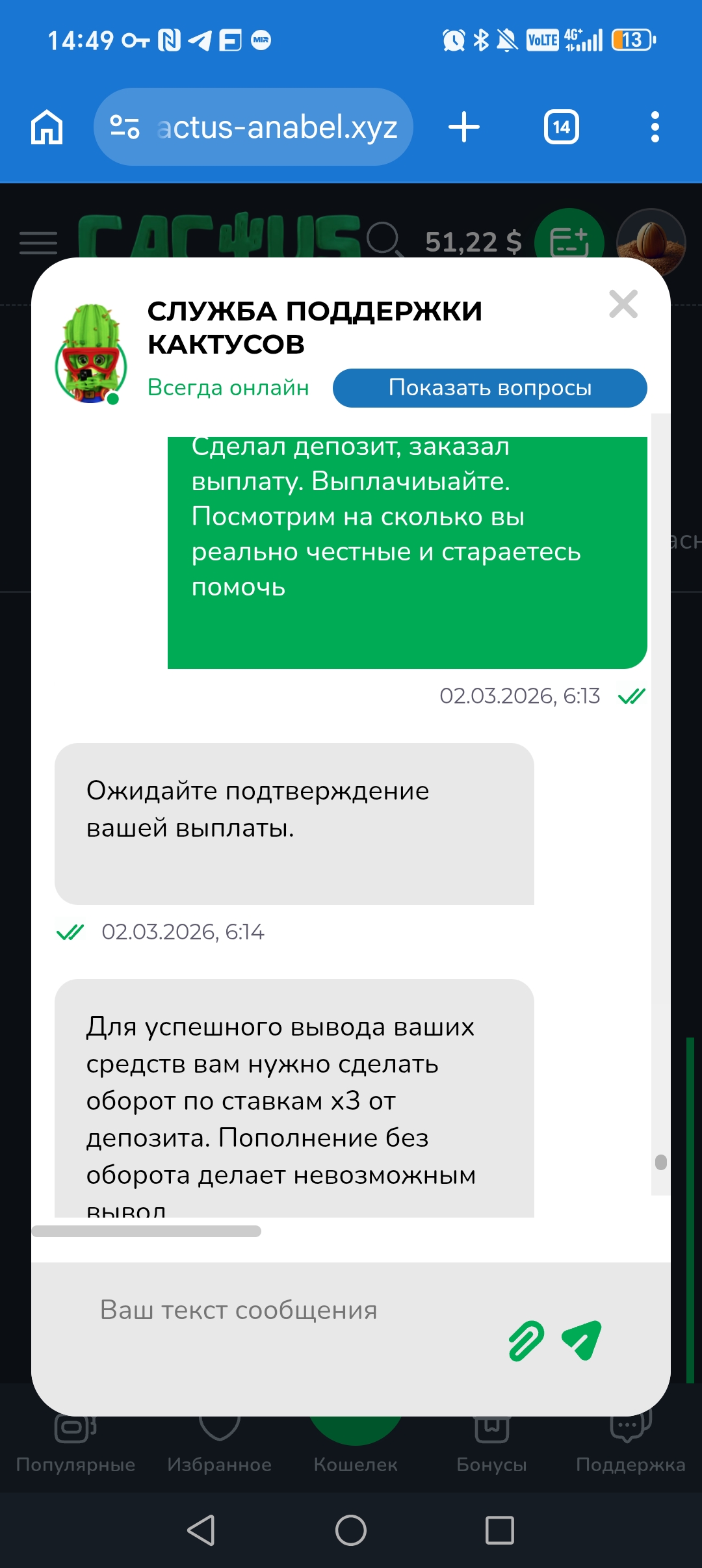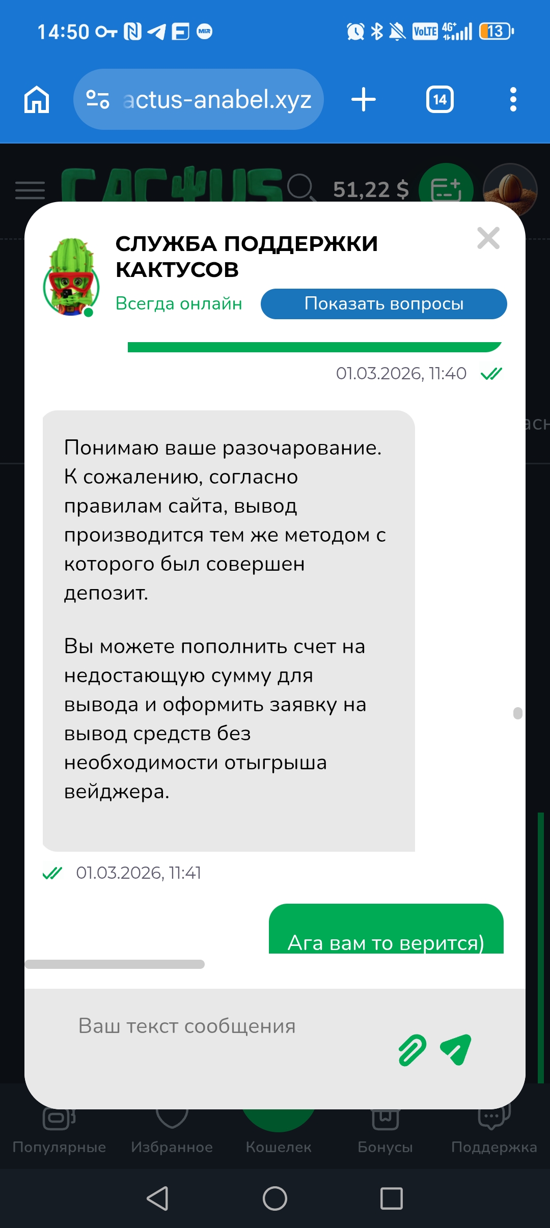 Позже пишут пополните баланс на 20 и поставьте на вывод, никакого отыгрыша делать не надо. Несколько раз это написали, ну и что?) я делаю депозит сегодня, а они мне пишут отыгрывать х3 его. Хаха просто цирк