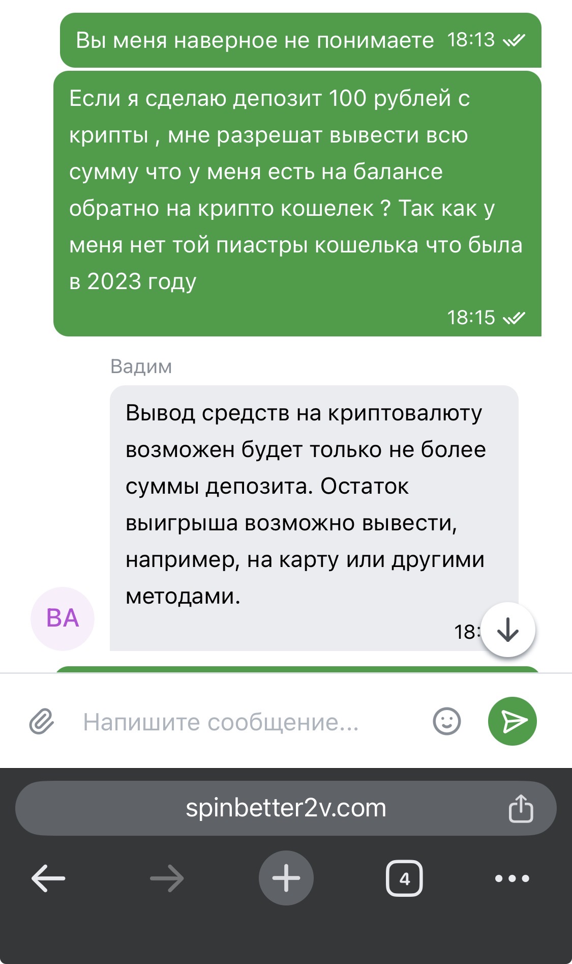 Повезло. Но в моем случае отказали мне выводить на крипту, так как в 2023 году был сделан депозит с пиастры и я мог тока на нее заказать на вывод. Я им это объяснял много раз, что нет у меня той пиастры больше. На что они мне предложили тока привязать карту и на нее ставить на вывод. Но привязать карту у меня не поручалось в связи с бесконечными ошибками, да и я рисковать банком не очень то хотелось.