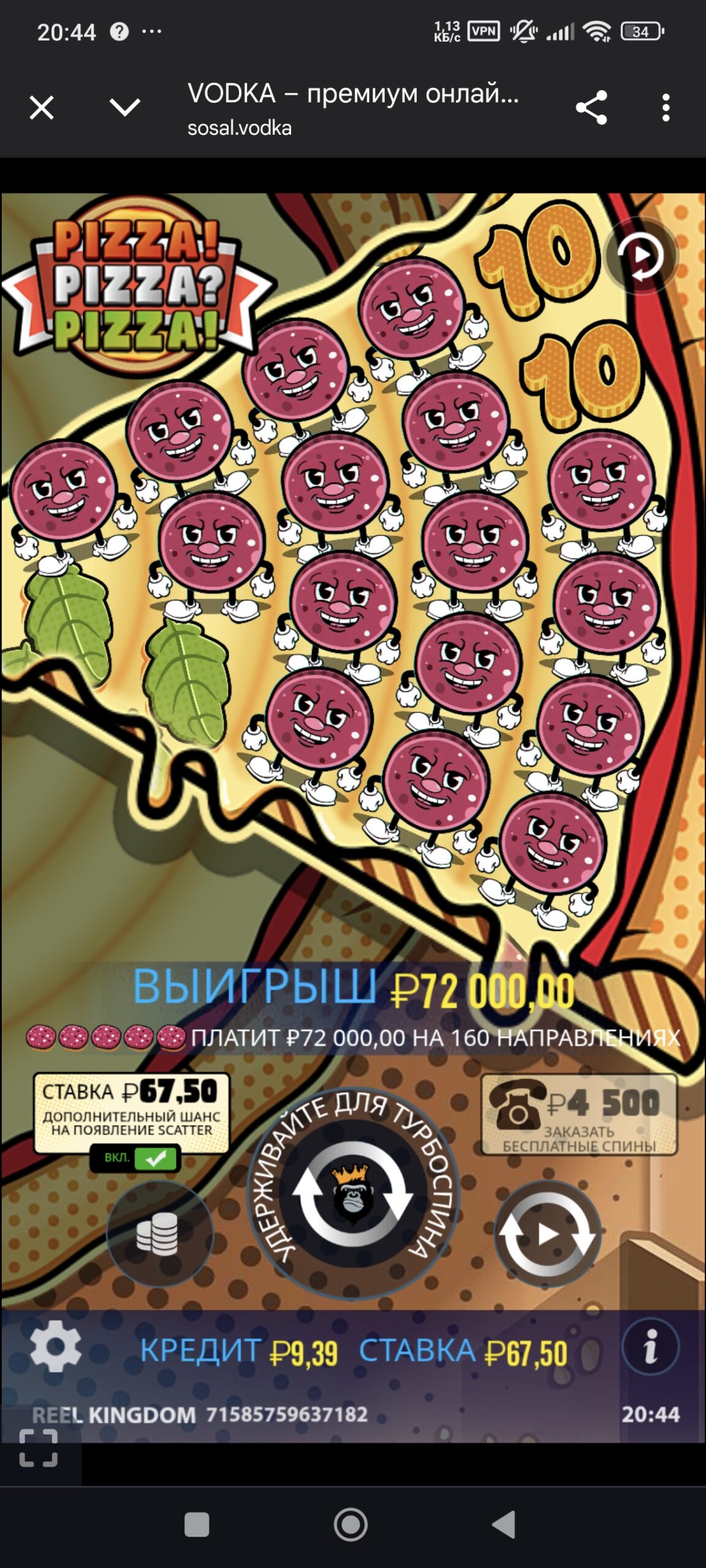 Всех приветствую!!! Оставлю свой отзыв о слоте Pizza! Pizza? Pizza! от reel kingdom дочерней компании pragmatic play.Данный видеослот вышел двенадцатого декабря две тысячи двадцать второго года.Данный слот чем-то напоминает слоты от этого же провайдера которые в простонародье называют рыбалка.В данном слоте можно поймать от трёх до пяти скаттеров и за них дадут разное число бонусных вращений,за три дадут десять вращений, за четыре пятнадцать,за пять двадцать вращений.Суть бонуса такова вы играете на части пиццы и вам нужно ловить машинку доставщика чтобы он собрал как можно больше перцев в выплатами, а есть ещё золотая машинка доставщика пиццы, он открывает всю пиццу и собирается все находящиеся на поле перцы.Максисальный выигрыш в слоте икс семь тысяч двести от вашей ставки.Так же прикрепляют скрин на котором вы можете видеть чтобы я обычным спином поймал вполне не плохой икс, икс тысячу шесть сот, и как видите если б закрыл всё то и выигрыш был намного больше, так что у слота есть потенциал)