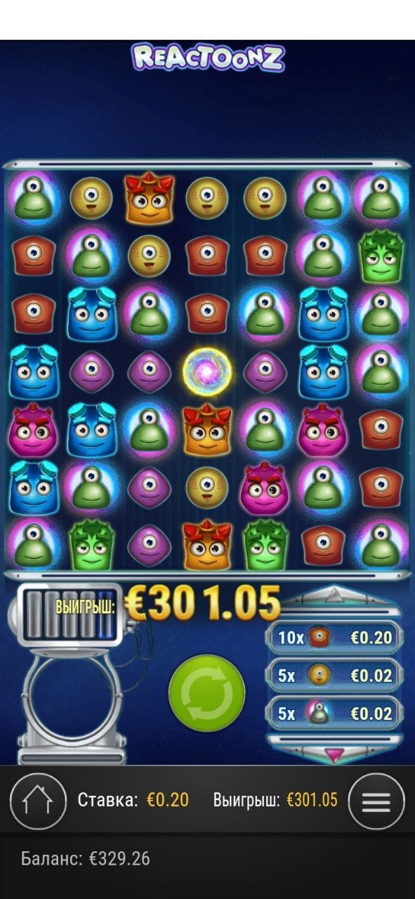данный слот Reactoonz очень интересный особенно если поймаешь бонус,там сам электрод типа вылезает и всё там бац бац мигает перемигивает и всё там взрывается и в итоге получается бывает не плохая сумма выигрыша.