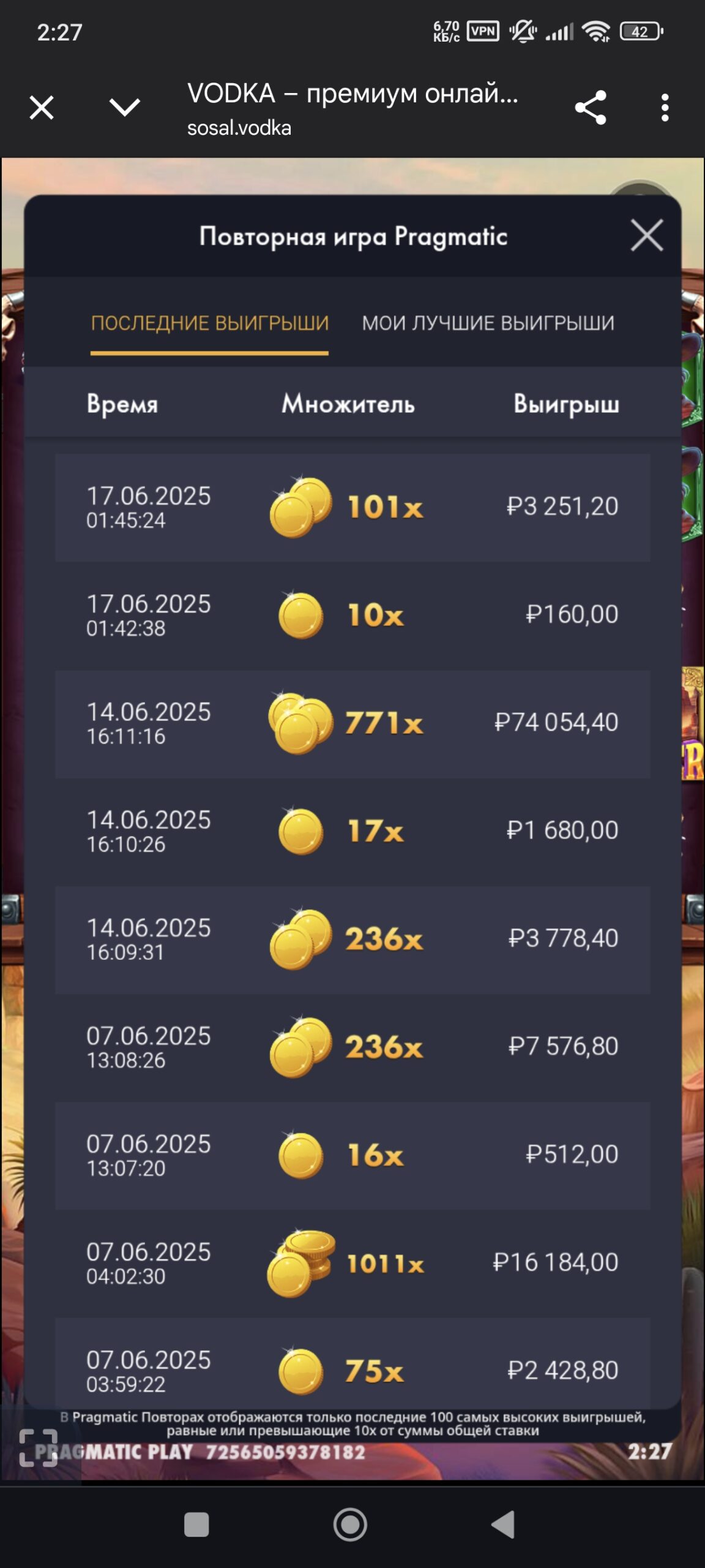 Всех приветствую!!! Поделюсь своим опытом из новинок pragmatic play.Данный слот вышел буквально недавно, второго июня две тысячи двадцать пятого года, и как я заметил полюбился многим игрокам включая меня, я покажу вам свой результат в скрине, вот там выигрыш семьдесят четыре тысячи рублей по девяносто шесть рублей, на самом деле ставка сорок восемь рублей, это я включил дополнительную кнопку,икс два от ставки) но перед тем как поймать данный занос, я покупал топовую за восемь тысяч рублей если считать по шестнадцать рублей, которая можно сказать никак не окупилась,ну и соответственно мне не понравился данный результат и я резко после бонуса включил доп ставку и повысил ставку и буквально с третьего спина выпала обычная бонуска, которая и дала такой хороший выигрыш, причем сыгровка была на самом последнем спине, так что у данного слота есть хороший потенциал, буду дальше продолжать в него играть, но бонусы икс пятьсот от ставки надо прекращать мне покупать)))Всем добра и никаких замазок.