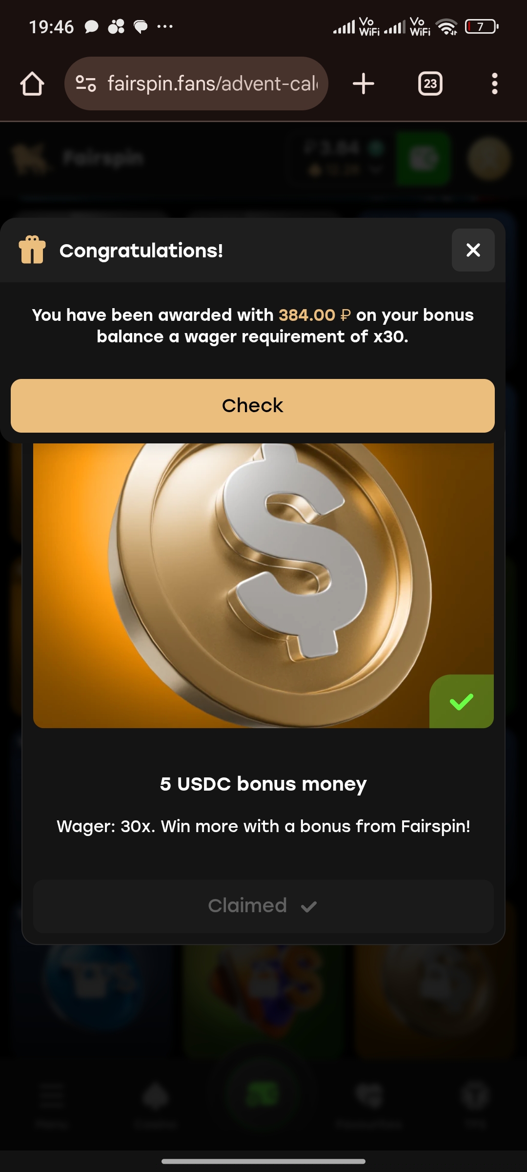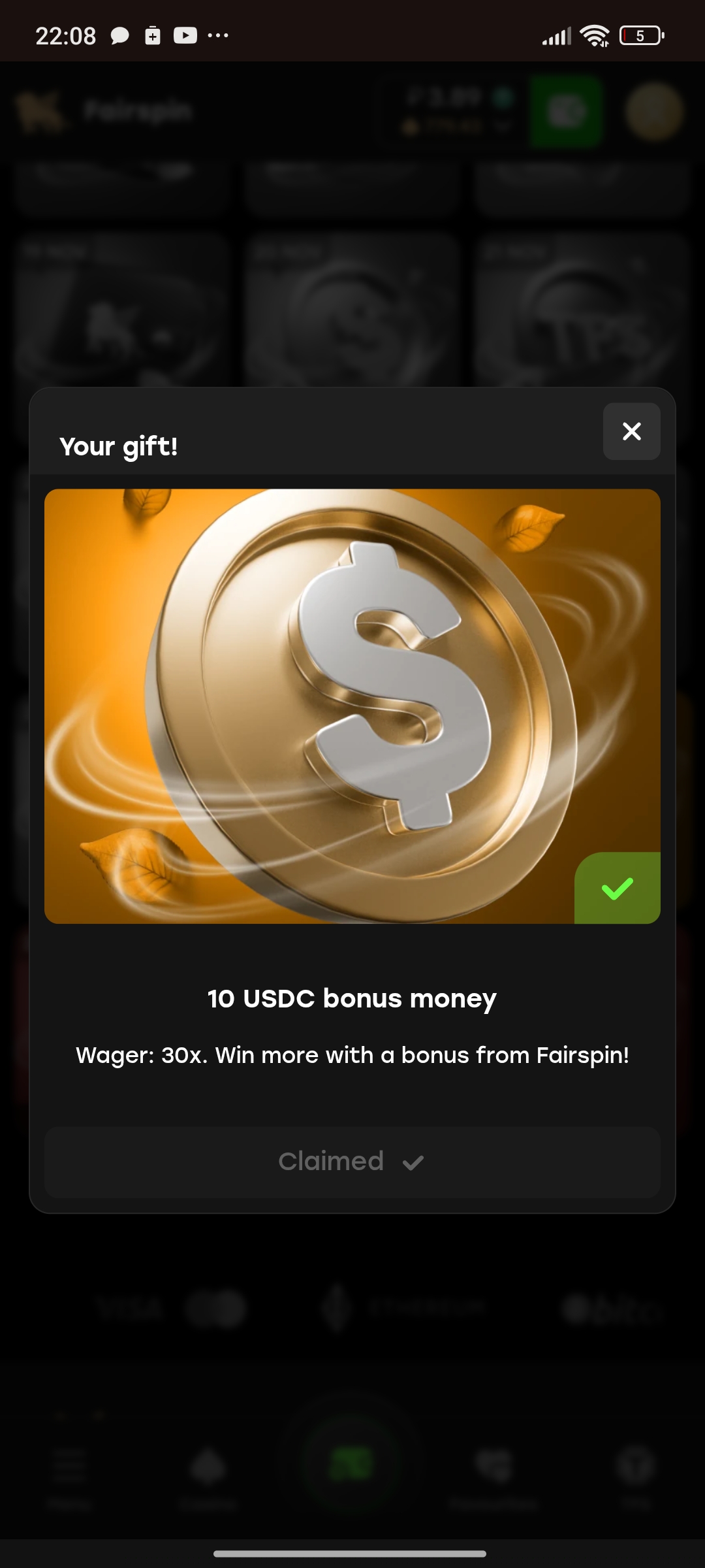 Fairspin в календаре 10 USDC bonus money