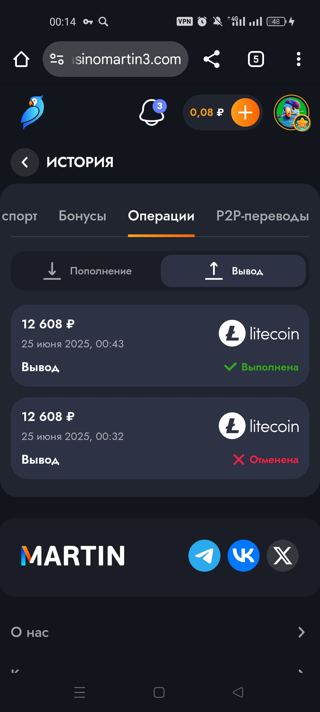 Сайт даволі прыборны, у мяне не ўзнікла праблем з рэгістрацыяй і верифікацыяй. Martin casino прапануе вялікі выбар гульняў, сайт яркі і чытэльны. Я хутка прайшоў верифікацыю праз чат і вырашыў пагуляць з маленькім дэпазітам, скажам, пратэставаць, што за казіно) Я зрабіў дэпазіт 1500 праз крыптакашалёк. Гуляў у слоты ад PG Soft, не бачыў вялікага аддачы і ў выніку прайграў. Потым прыняў удзел у раздачы на канале Telegram і выйграў 10000₽ на баланс Martin casino. Пагуляў з гэтых 10k, купляў бонусы і баланс апусціўся да 800₽, але мне ўдалося раскруціць яго да 12000₽. Я запытаў вывад таксама на крыпта. Першы раз яго адмінавалi, папрасілі ў чаце пацвердзіць адрас крыптакошалька. У выніку другі раз хутка выплацілі. Вельмі рады атрымаць такі фрыбі ад Martin.