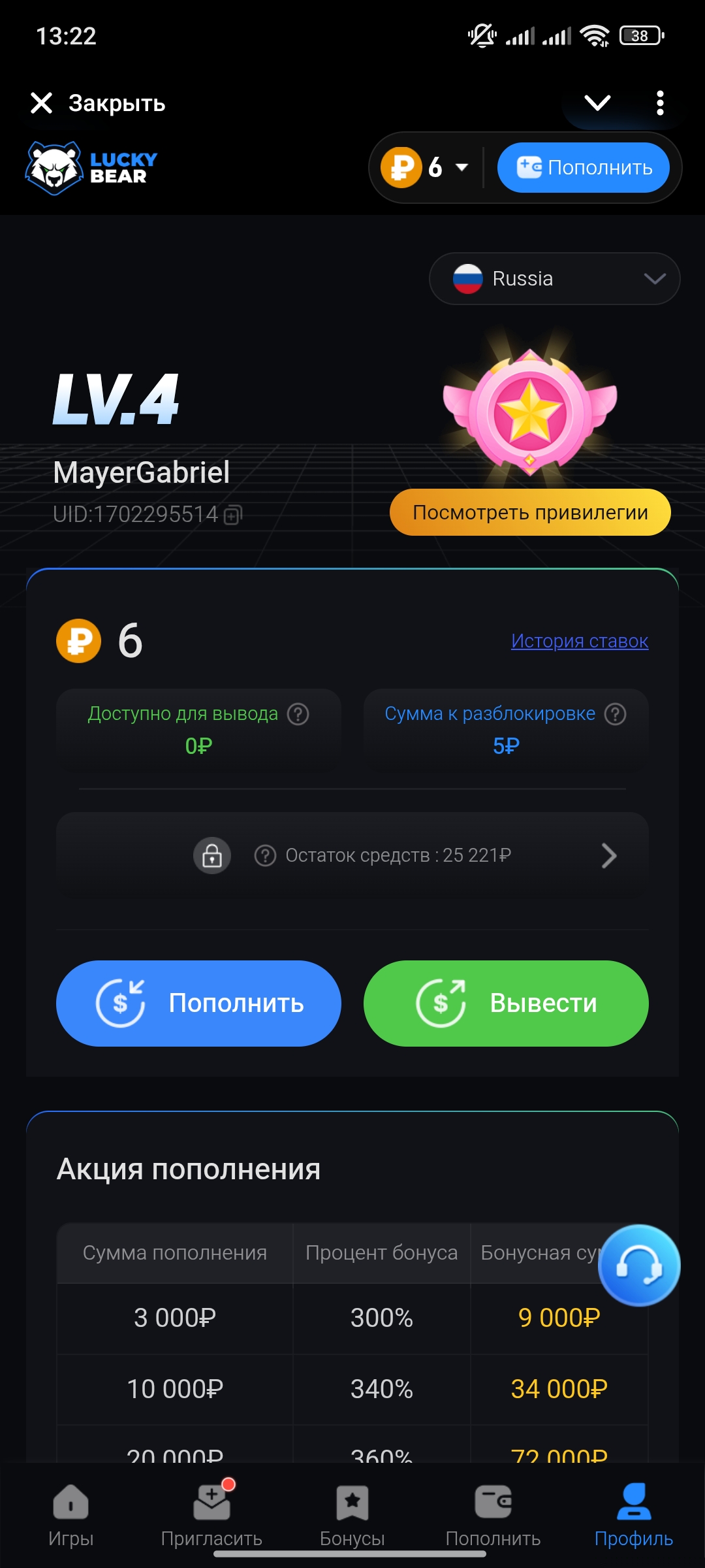 Гэта проста агіднае казіно, я дабраўся да ўзроўню 4 тут, стаўлю максімум 10–20 RUB за спін, дэпазітаў 19k, высноў адпаведна 0.